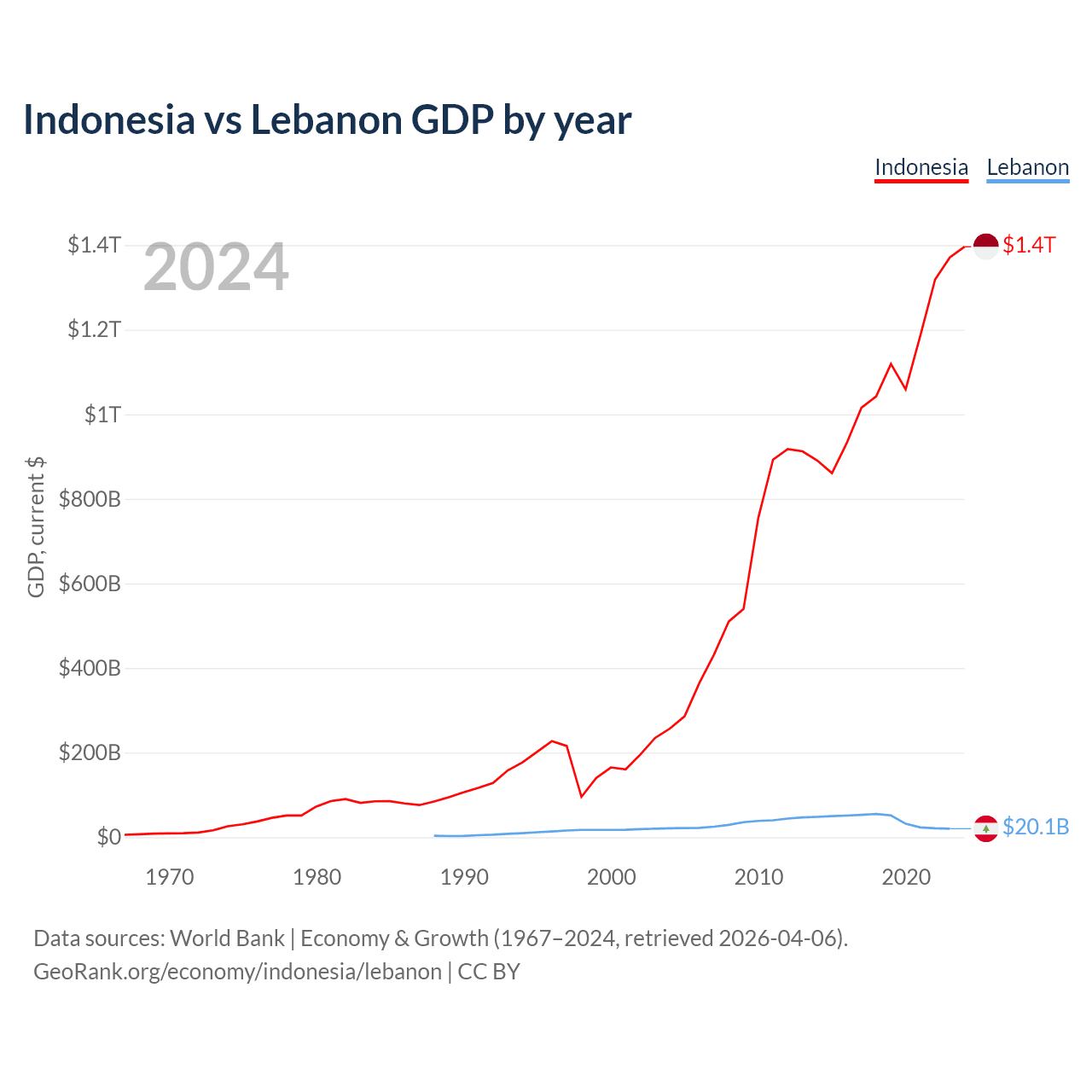 Indonesia has a GDP of $1.4T compared to $20.1B for Lebanon, ranking 16/197 and 128/197 by economy size, respectively.