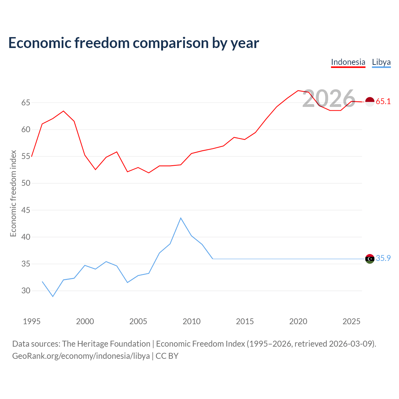 The Economic Freedom Index for Indonesia is 65.1, ranking 67/197, compared to 35.9 for Libya, ranking 189/197. The chart above displays a comparison of annual changes in economic freedom indexes.