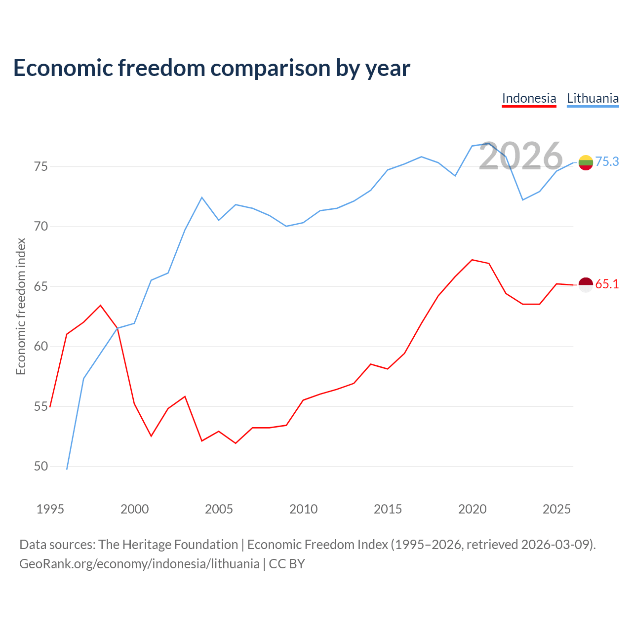 Data sources: The Heritage Foundation | Economic Freedom Index (1995–2026, retrieved 2026-03-09).
