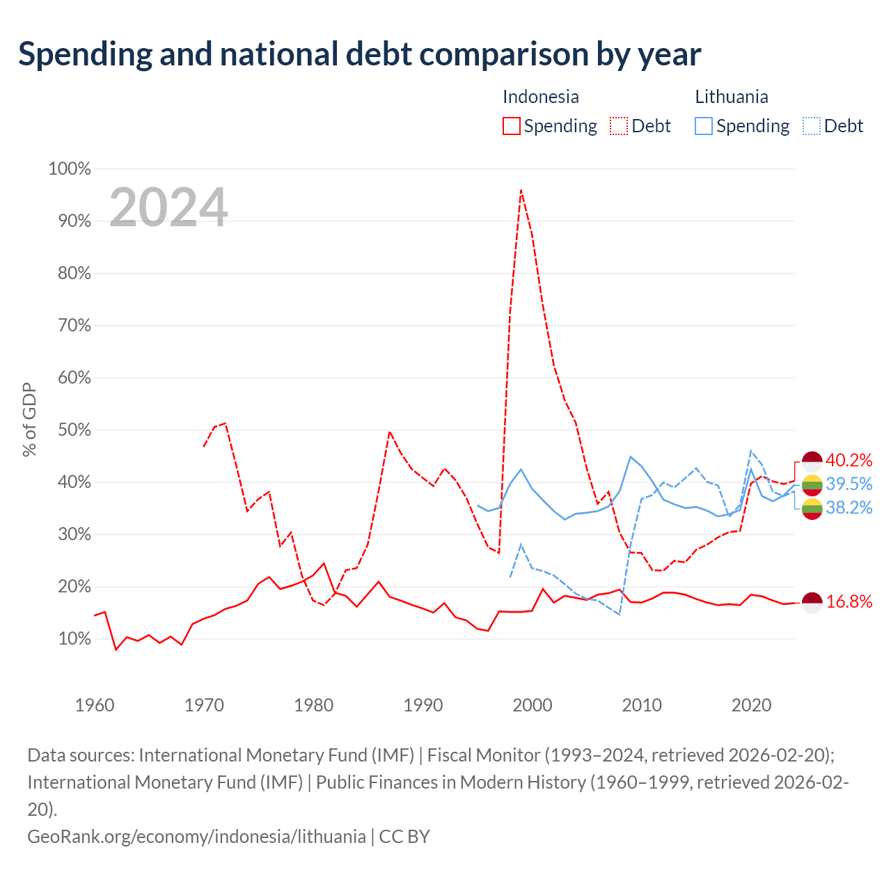 Indonesia has $561B in government debt (40.2% of GDP), compared to $32.4B (38.2% of GDP) in Lithuania.