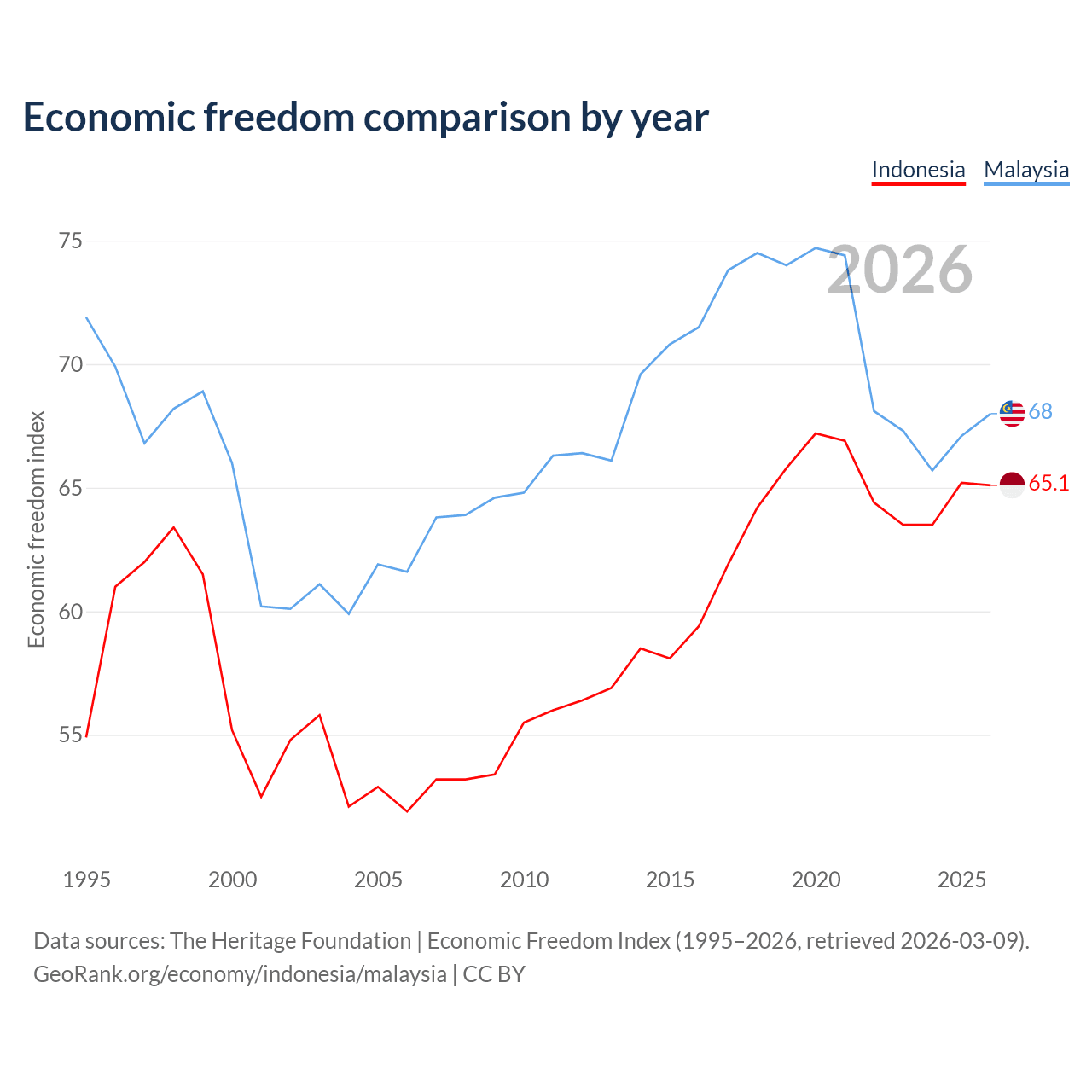 Data sources: The Heritage Foundation | Economic Freedom Index (1995–2026, retrieved 2026-03-09).
