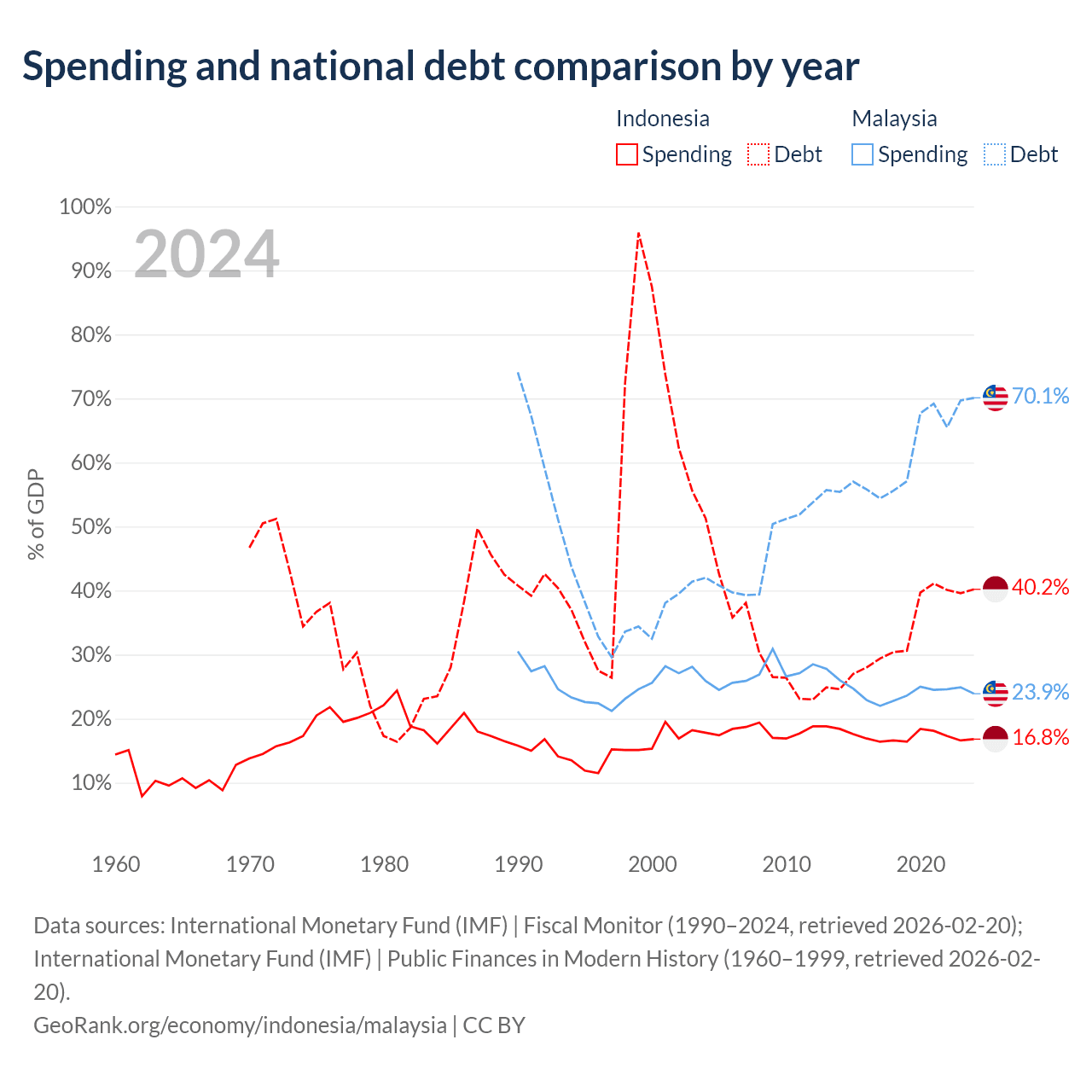 Indonesia has $561B in government debt (40.2% of GDP), compared to $296B (70.1% of GDP) in Malaysia.