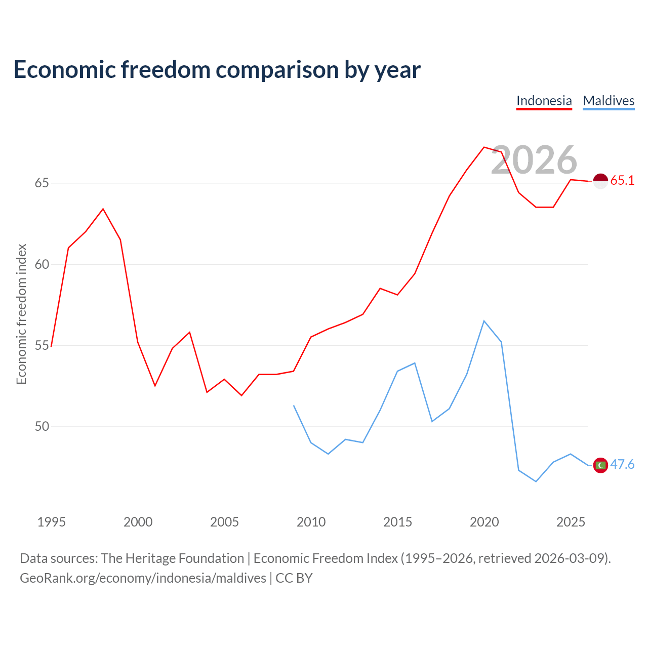 The Economic Freedom Index for Indonesia is 65.1, ranking 67/197, compared to 47.6 for Maldives, ranking 174/197. The chart above displays a comparison of annual changes in economic freedom indexes.
