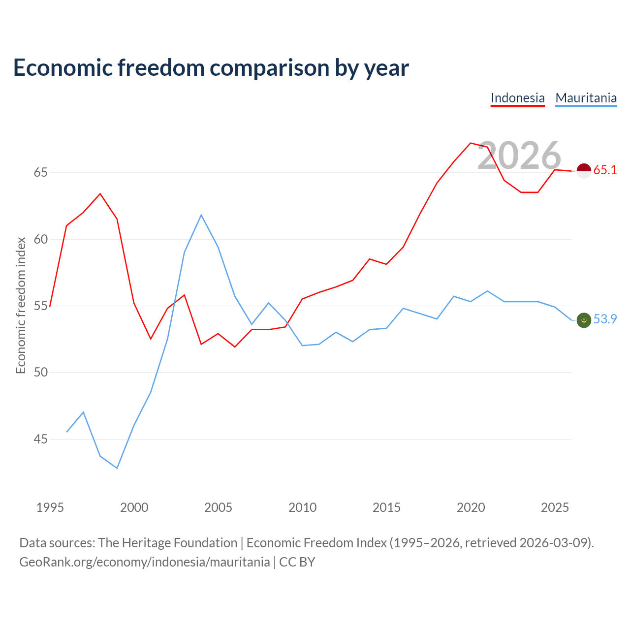 The Economic Freedom Index for Indonesia is 65.1, ranking 67/197, compared to 53.9 for Mauritania, ranking 136/197. The chart above displays a comparison of annual changes in economic freedom indexes.
