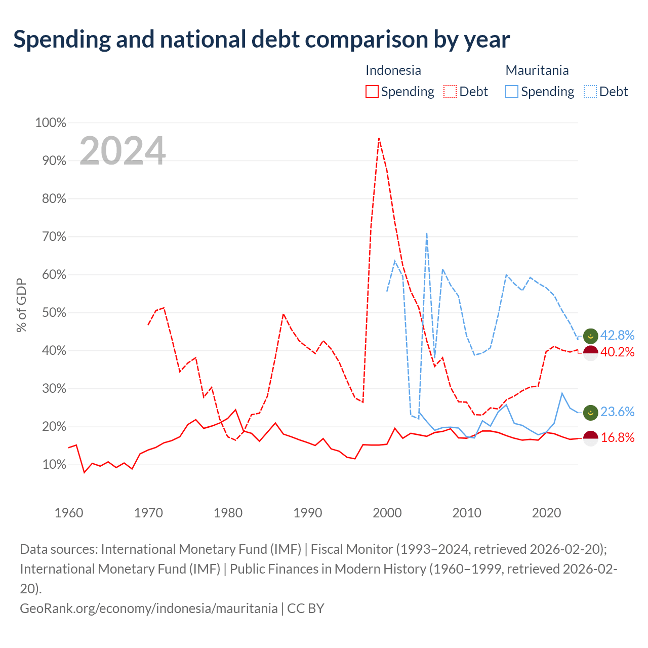 Indonesia has $561B in government debt (40.2% of GDP), compared to $4.67B (42.8% of GDP) in Mauritania.