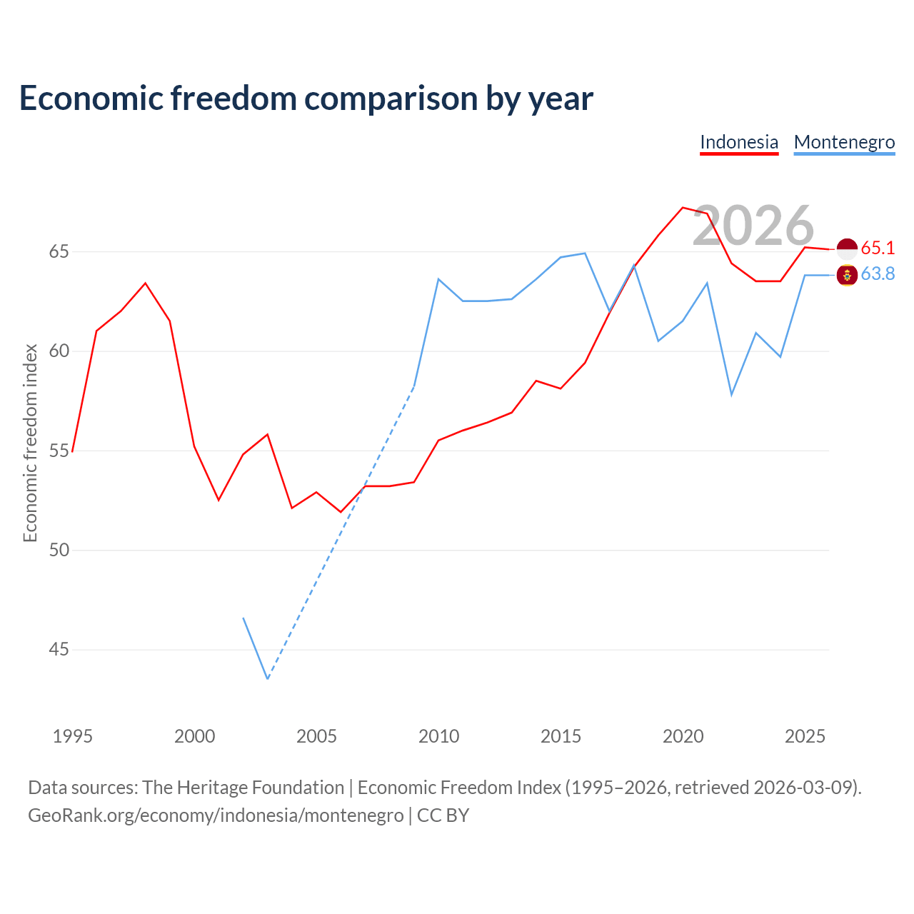 The Economic Freedom Index for Indonesia is 65.1, ranking 67/197, compared to 63.8 for Montenegro, ranking 78/197. The chart above displays a comparison of annual changes in economic freedom indexes.