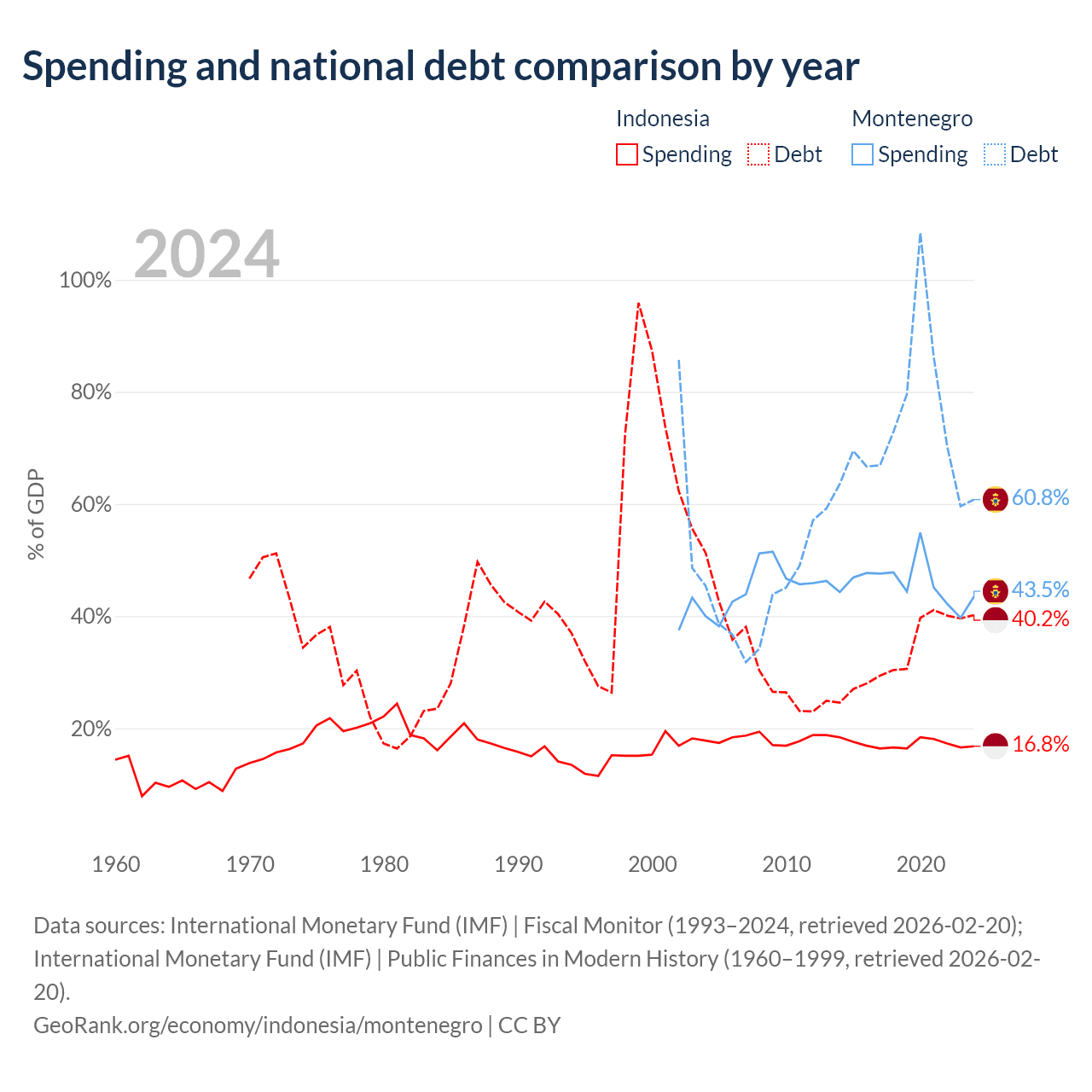 Indonesia has $561B in government debt (40.2% of GDP), compared to $5.02B (60.8% of GDP) in Montenegro.