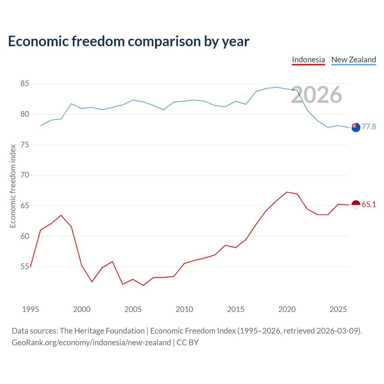 The Economic Freedom Index for Indonesia is 65.1, ranking 67/197, compared to 77.8 for New Zealand, ranking 13/197. The chart above displays a comparison of annual changes in economic freedom indexes.