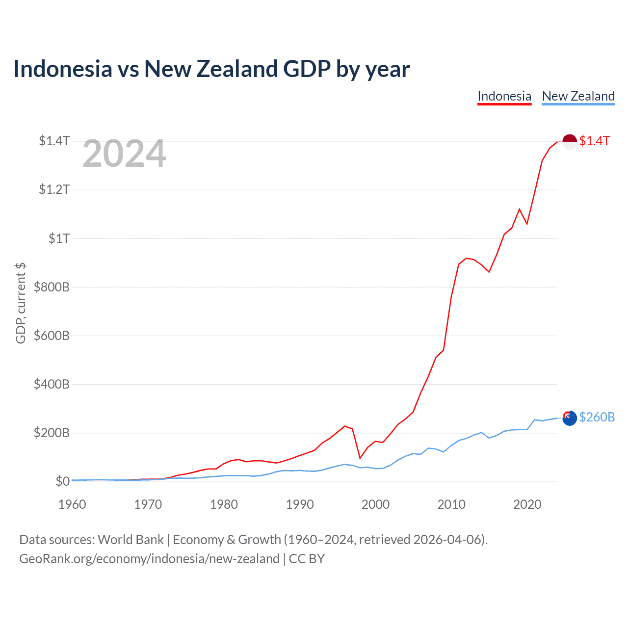 Indonesia has a GDP of $1.4T compared to $260B for New Zealand, ranking 16/197 and 52/197 by economy size, respectively.