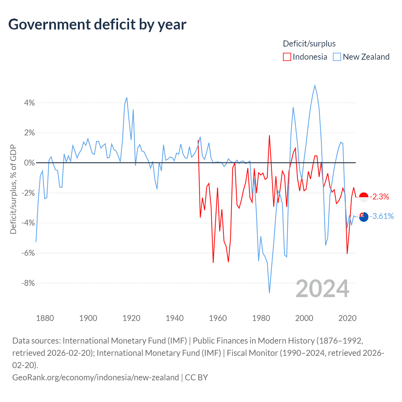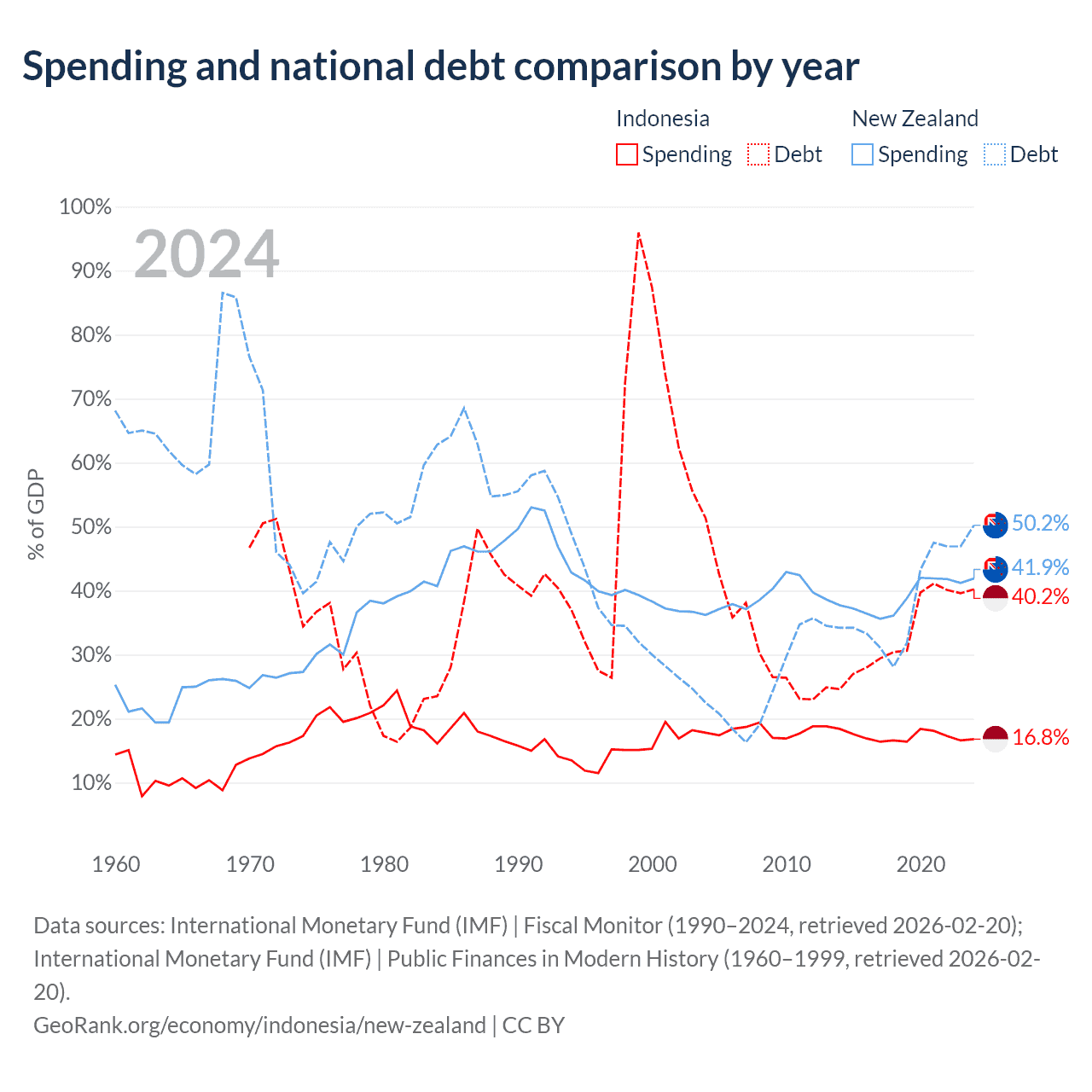 Indonesia has $561B in government debt (40.2% of GDP), compared to $131B (50.2% of GDP) in New Zealand.
