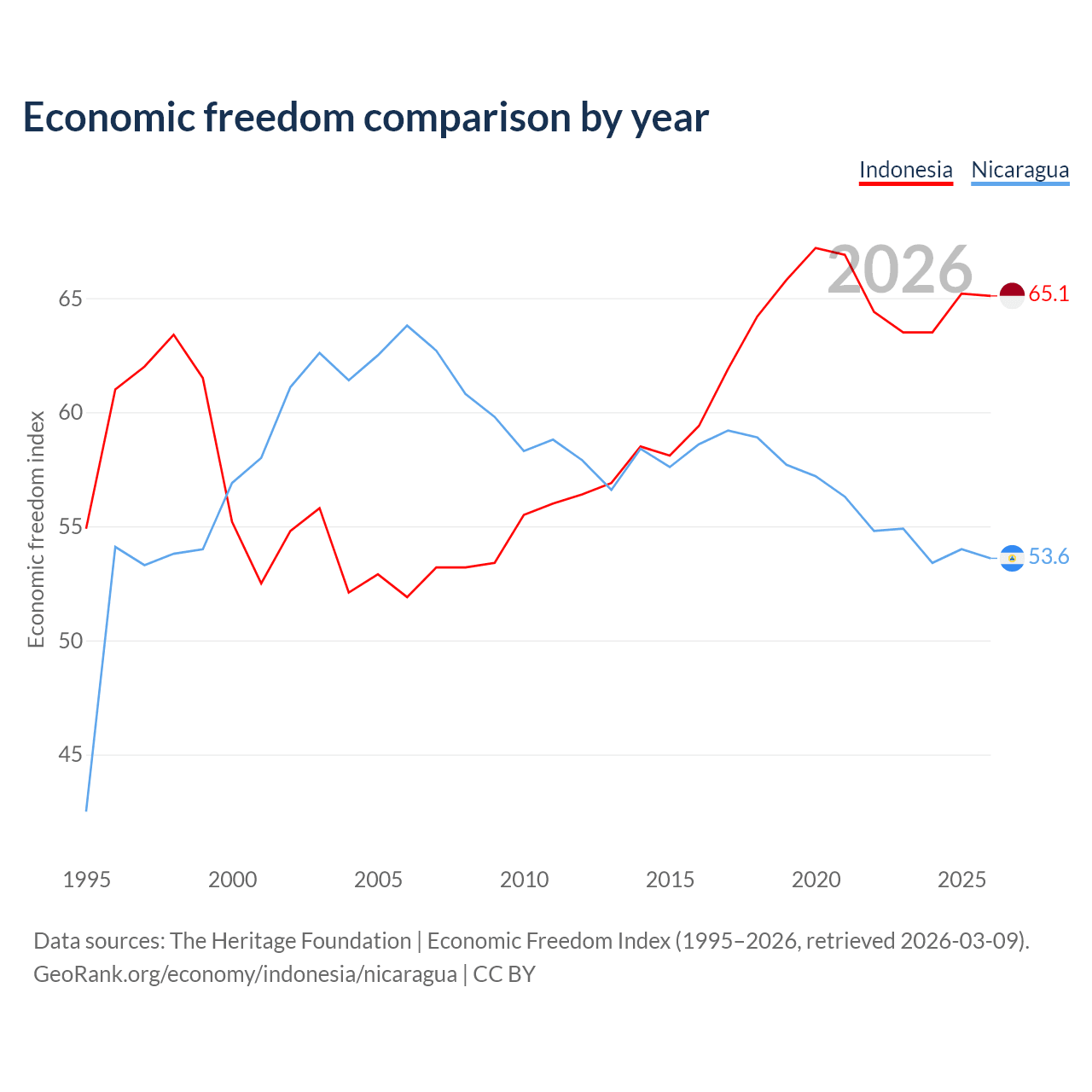 The Economic Freedom Index for Indonesia is 65.1, ranking 67/197, compared to 53.6 for Nicaragua, ranking 139/197. The chart above displays a comparison of annual changes in economic freedom indexes.