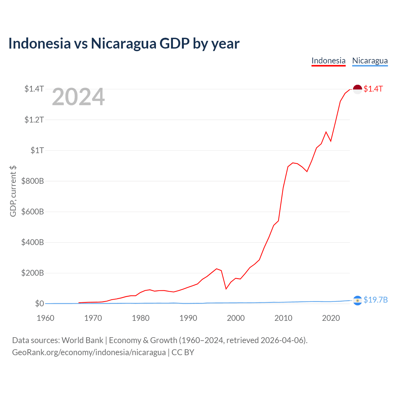 Indonesia has a GDP of $1.4T compared to $19.7B for Nicaragua, ranking 16/197 and 131/197 by economy size, respectively.