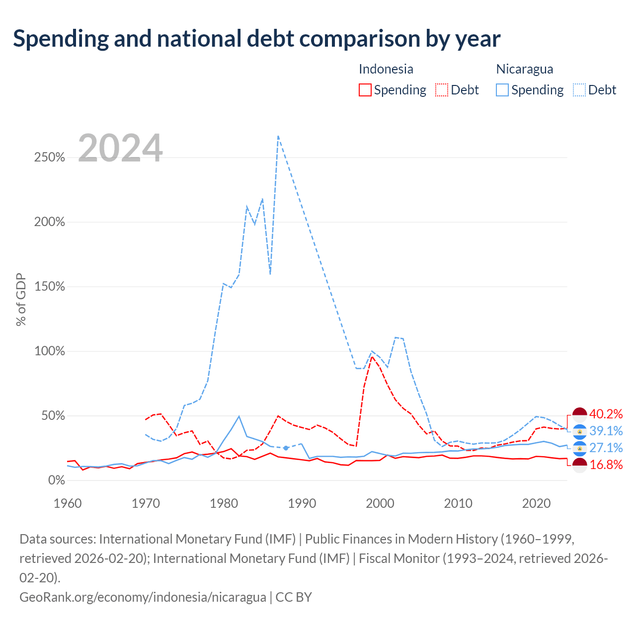Indonesia has $561B in government debt (40.2% of GDP), compared to $7.71B (39.1% of GDP) in Nicaragua.