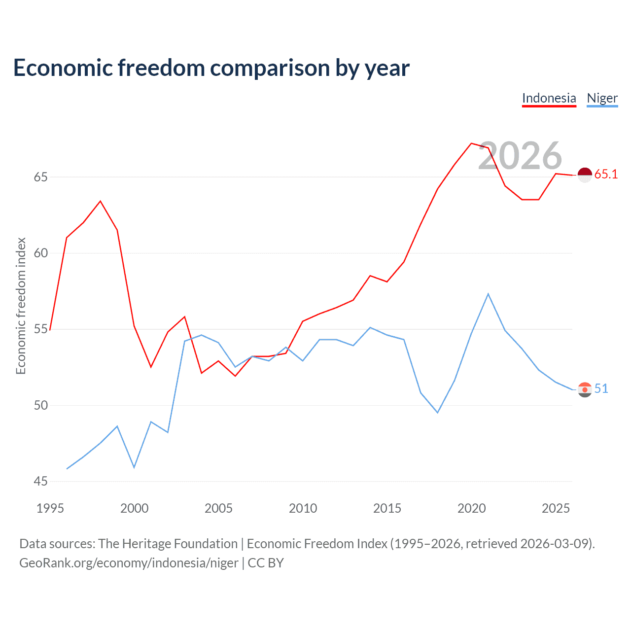 The Economic Freedom Index for Indonesia is 65.1, ranking 67/197, compared to 51 for Niger, ranking 156/197. The chart above displays a comparison of annual changes in economic freedom indexes.