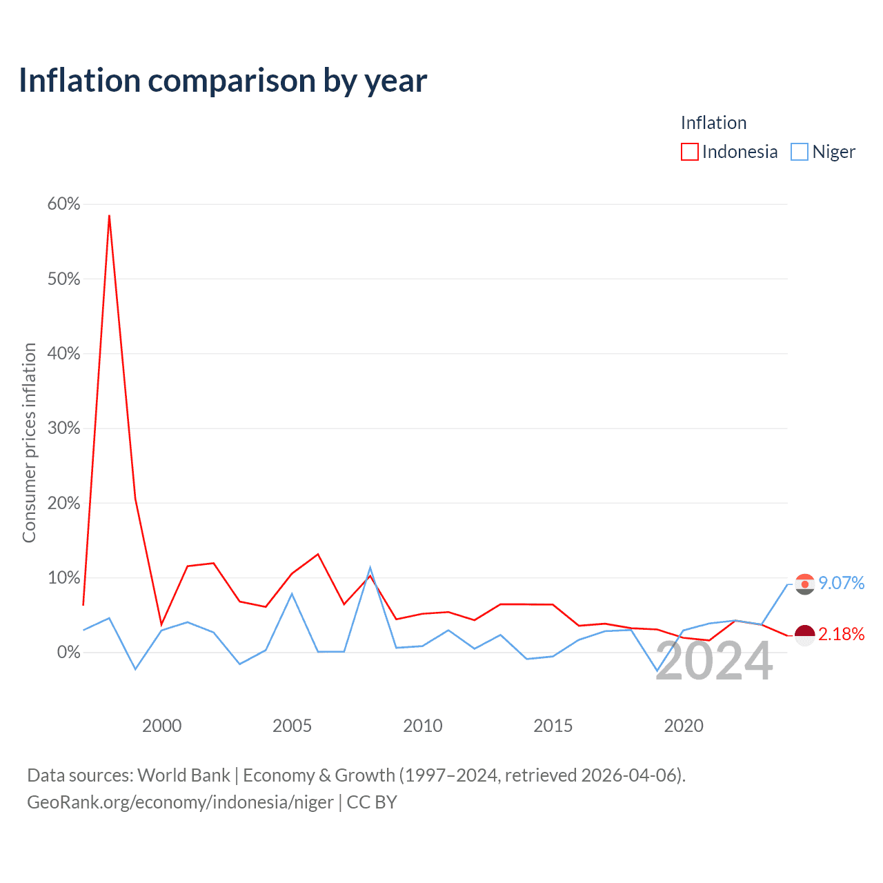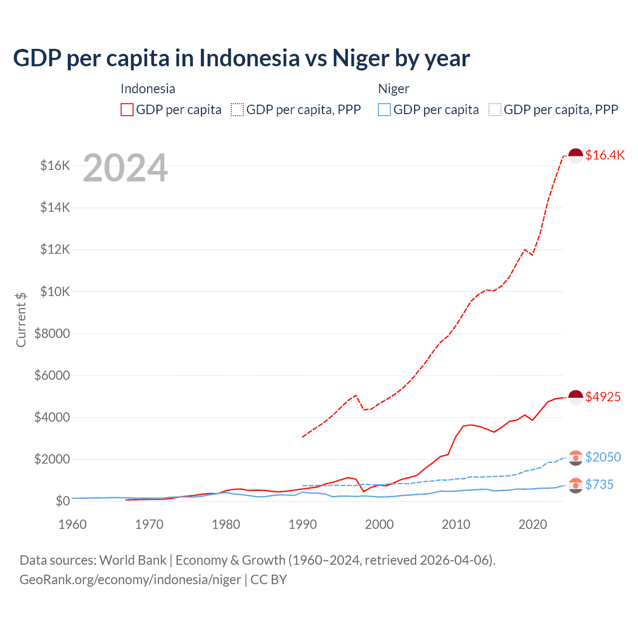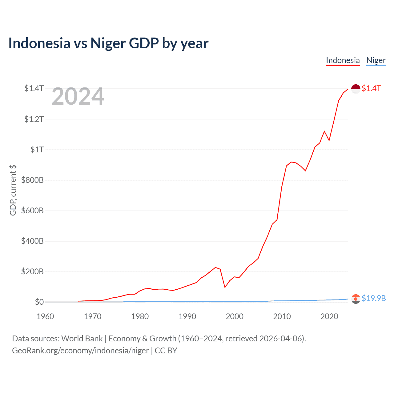 Indonesia has a GDP of $1.4T compared to $19.9B for Niger, ranking 16/197 and 130/197 by economy size, respectively.