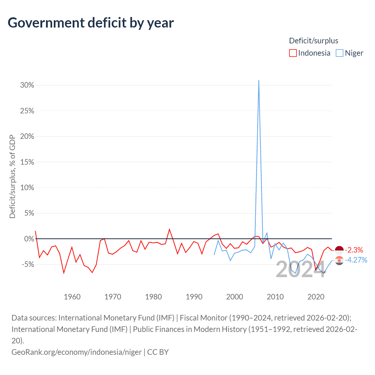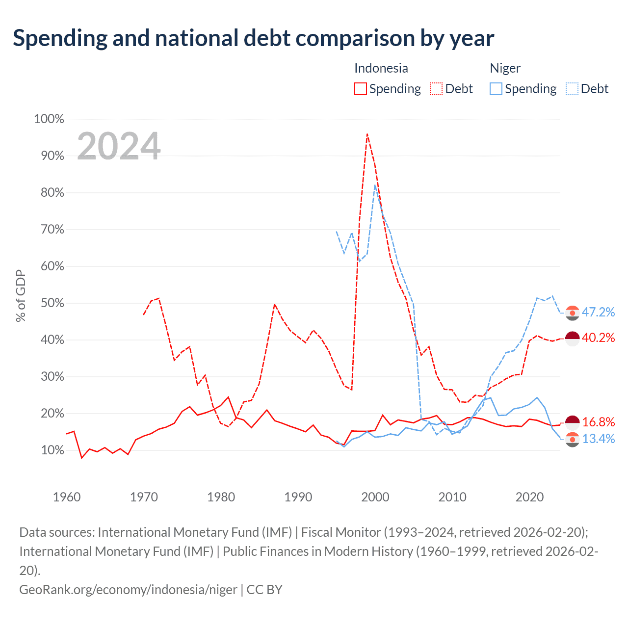 Indonesia has $561B in government debt (40.2% of GDP), compared to $9.39B (47.2% of GDP) in Niger.