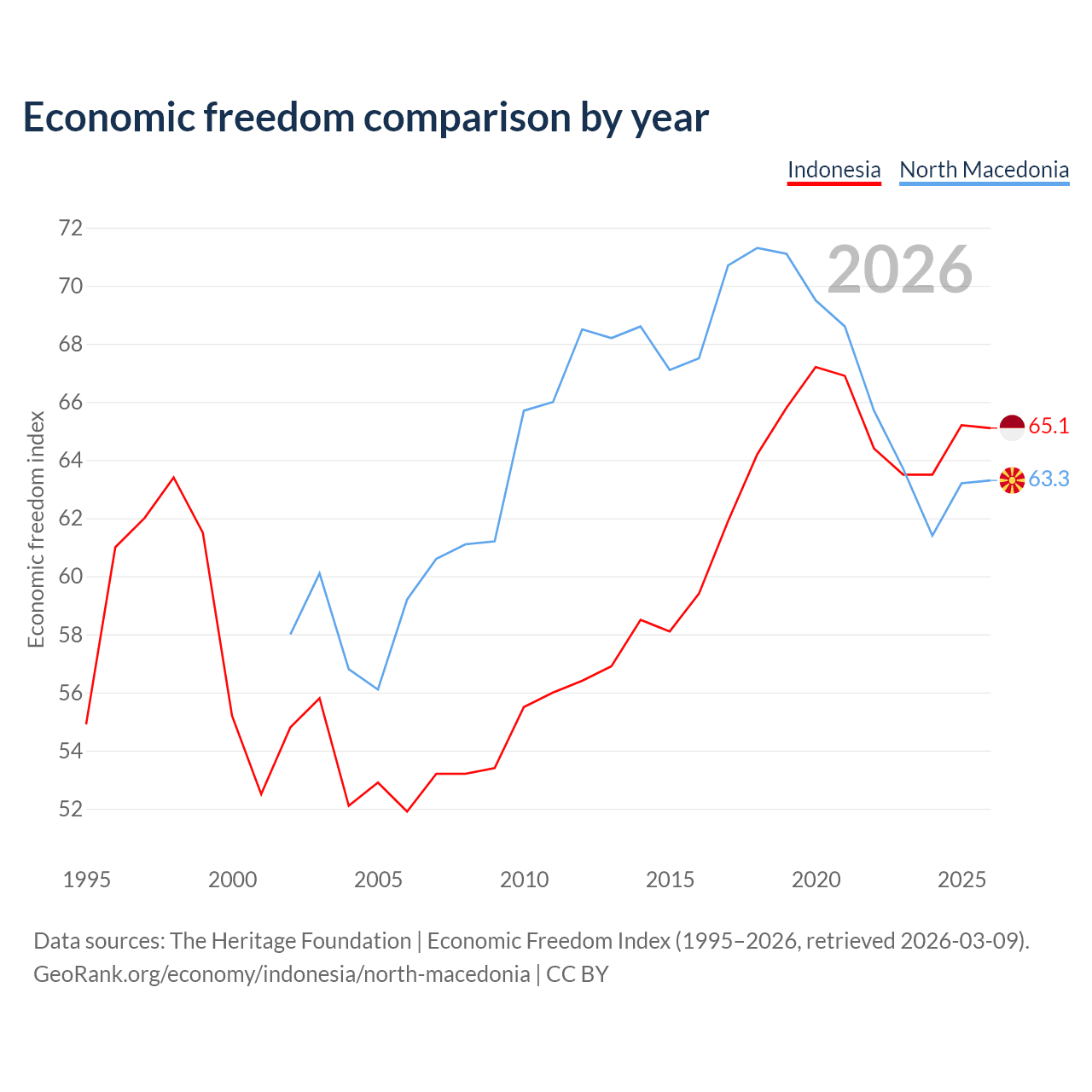 The Economic Freedom Index for Indonesia is 65.1, ranking 67/197, compared to 63.3 for North Macedonia, ranking 81/197. The chart above displays a comparison of annual changes in economic freedom indexes.