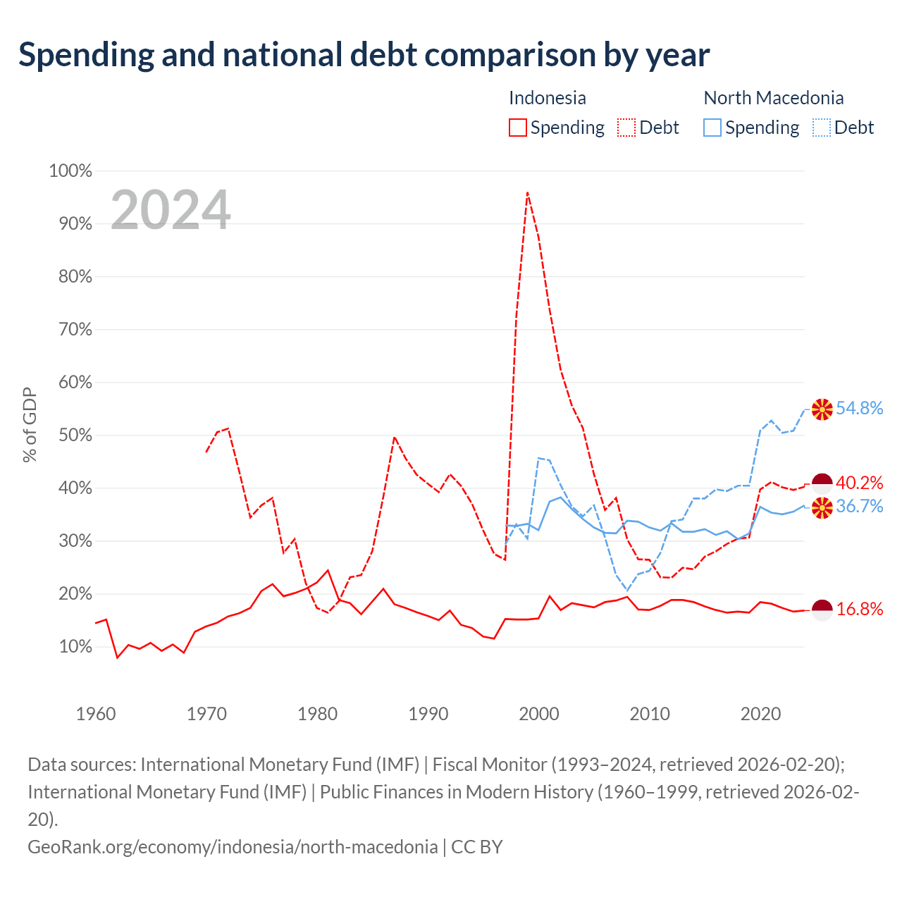 Indonesia has $561B in government debt (40.2% of GDP), compared to $9.3B (54.8% of GDP) in North Macedonia.