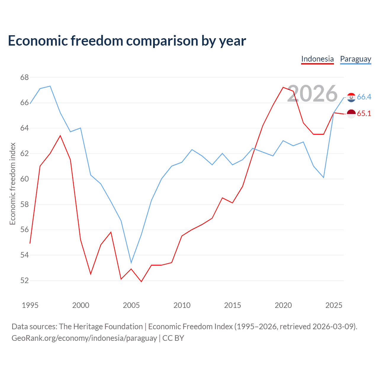 The Economic Freedom Index for Indonesia is 65.1, ranking 67/197, compared to 66.4 for Paraguay, ranking 61/197. The chart above displays a comparison of annual changes in economic freedom indexes.