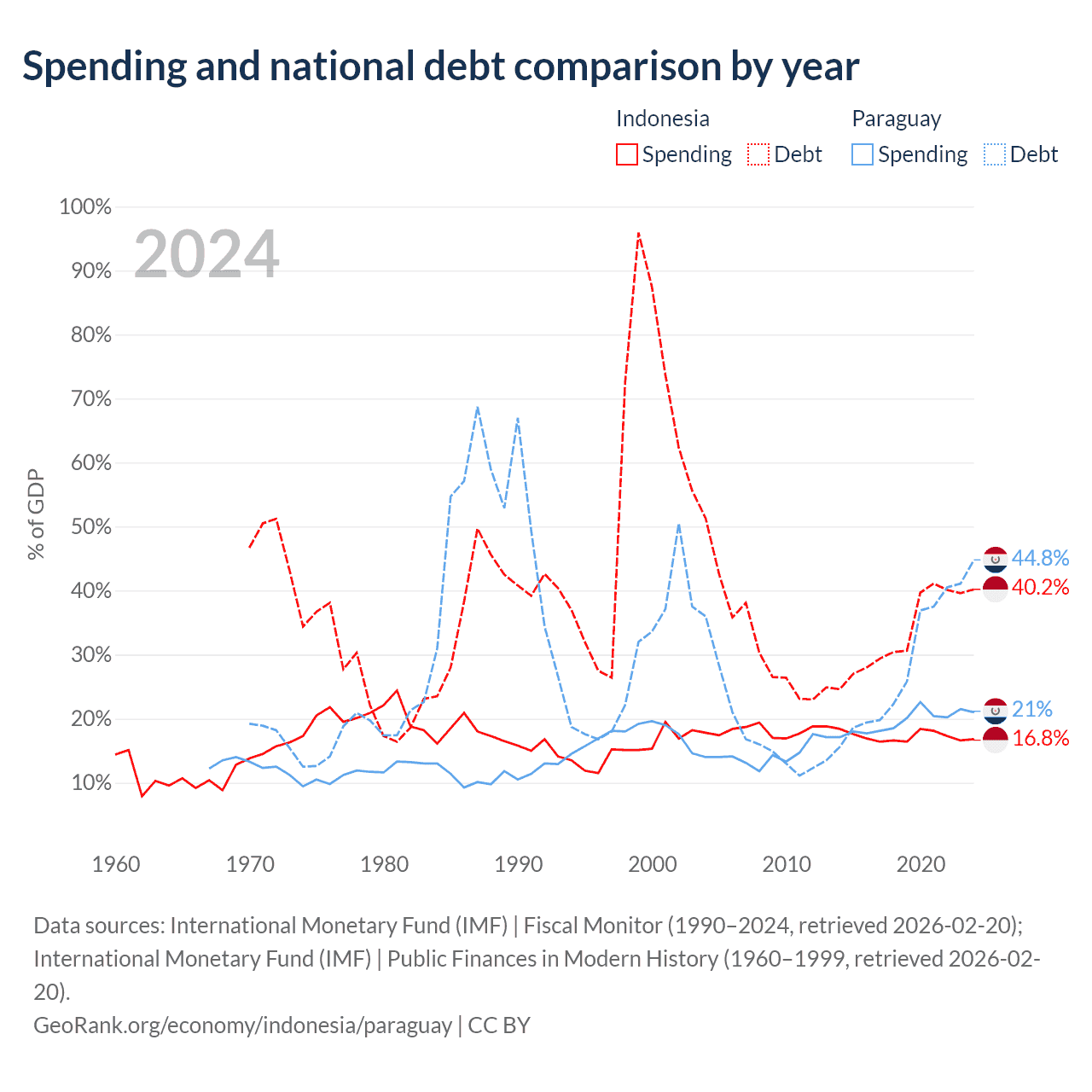 Indonesia has $561B in government debt (40.2% of GDP), compared to $19.9B (44.8% of GDP) in Paraguay.