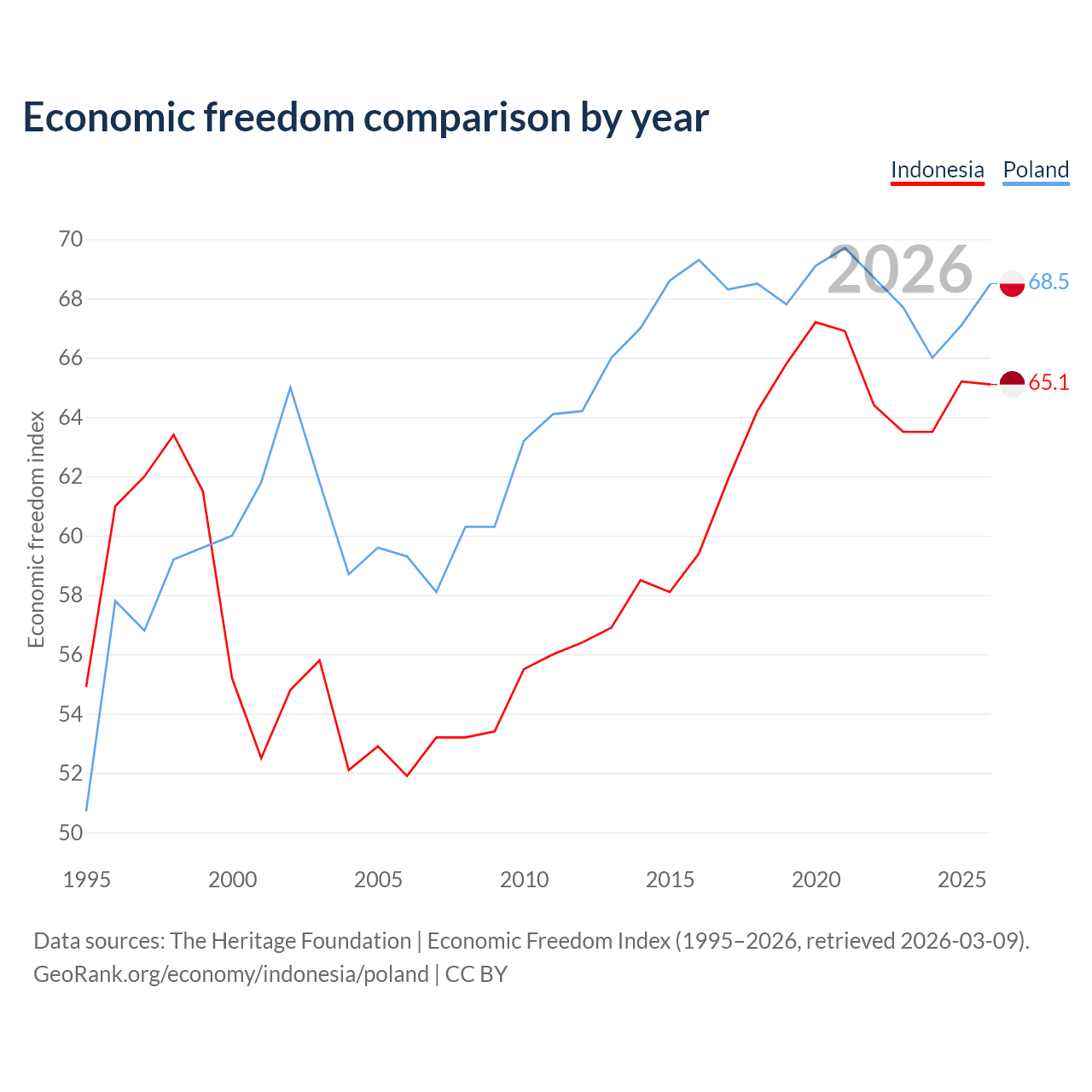 The Economic Freedom Index for Indonesia is 65.1, ranking 67/197, compared to 68.5 for Poland, ranking 46/197. The chart above displays a comparison of annual changes in economic freedom indexes.
