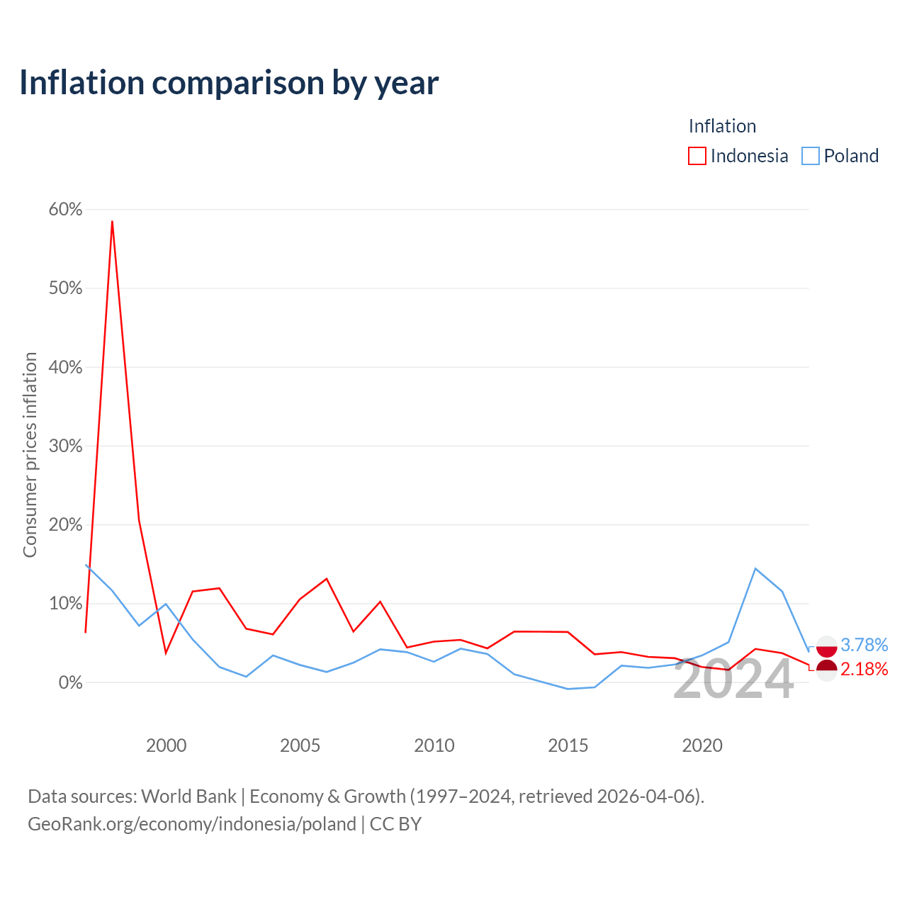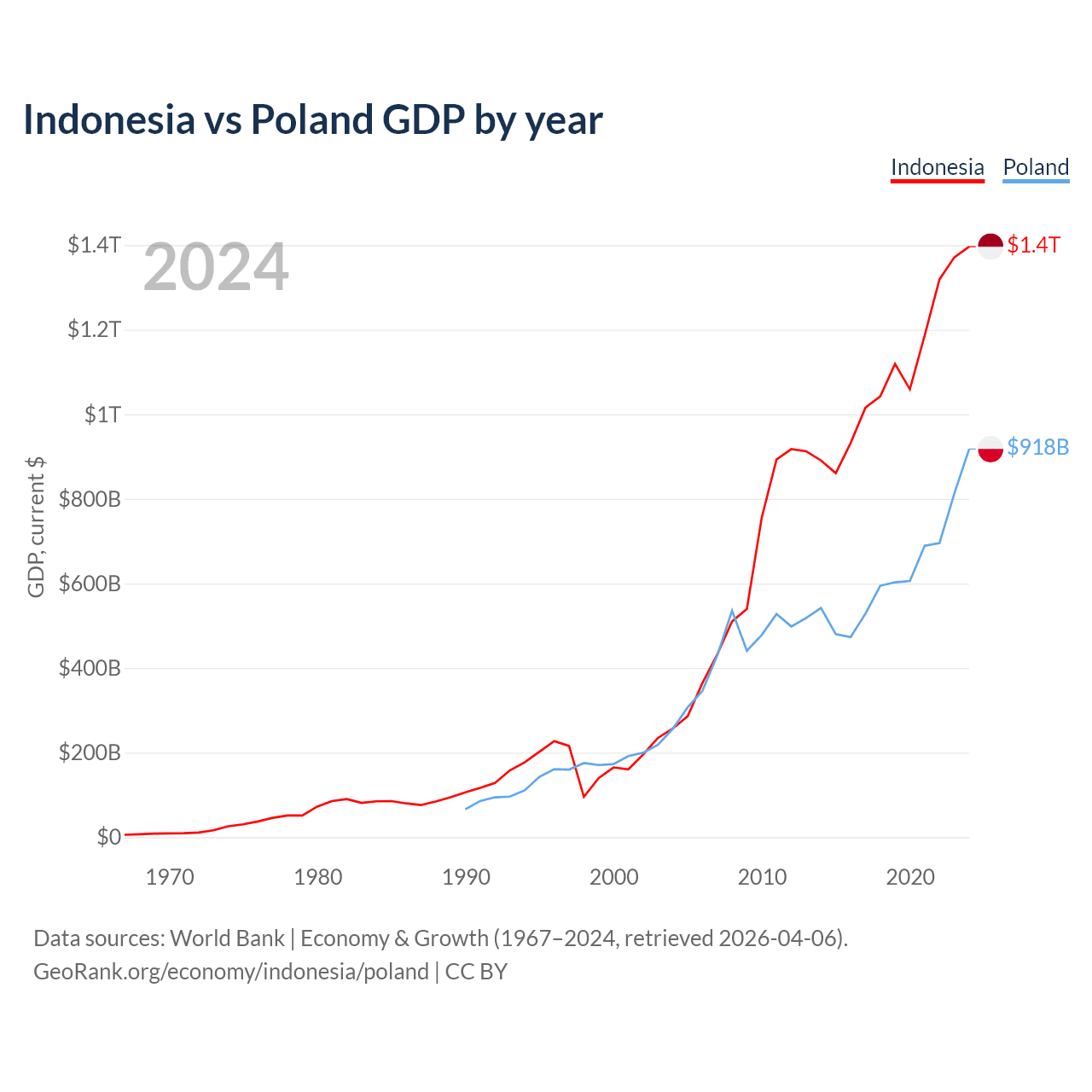 Indonesia has a GDP of $1.4T compared to $918B for Poland, ranking 16/197 and 21/197 by economy size, respectively.