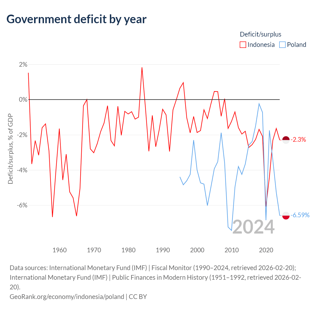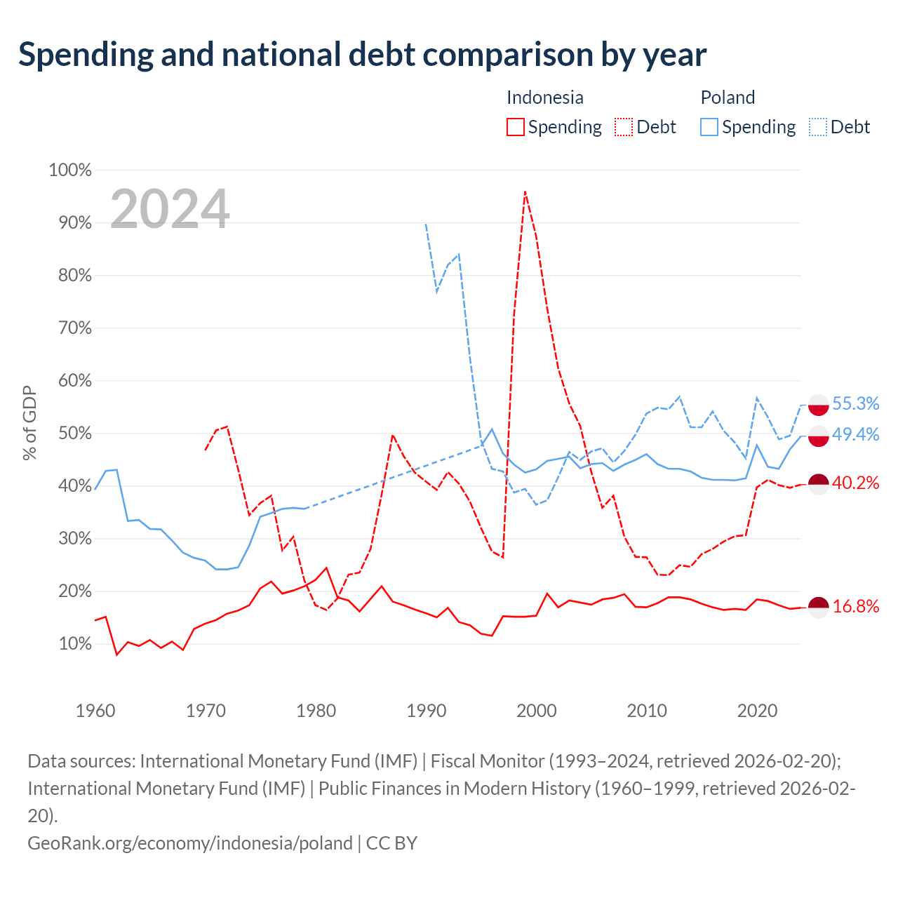 Indonesia has $561B in government debt (40.2% of GDP), compared to $507B (55.3% of GDP) in Poland.