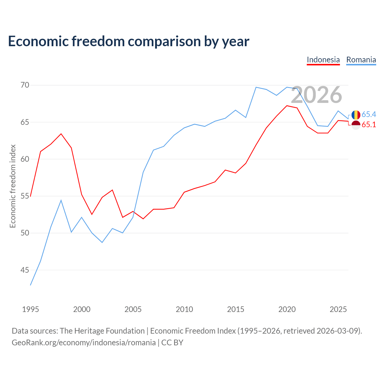 The Economic Freedom Index for Indonesia is 65.1, ranking 67/197, compared to 65.4 for Romania, ranking 64/197. The chart above displays a comparison of annual changes in economic freedom indexes.