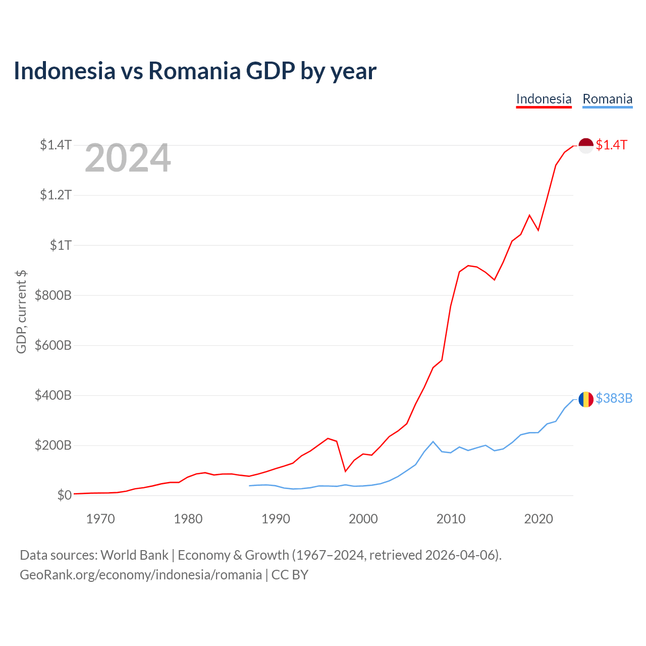 Indonesia has a GDP of $1.4T compared to $383B for Romania, ranking 16/197 and 42/197 by economy size, respectively.