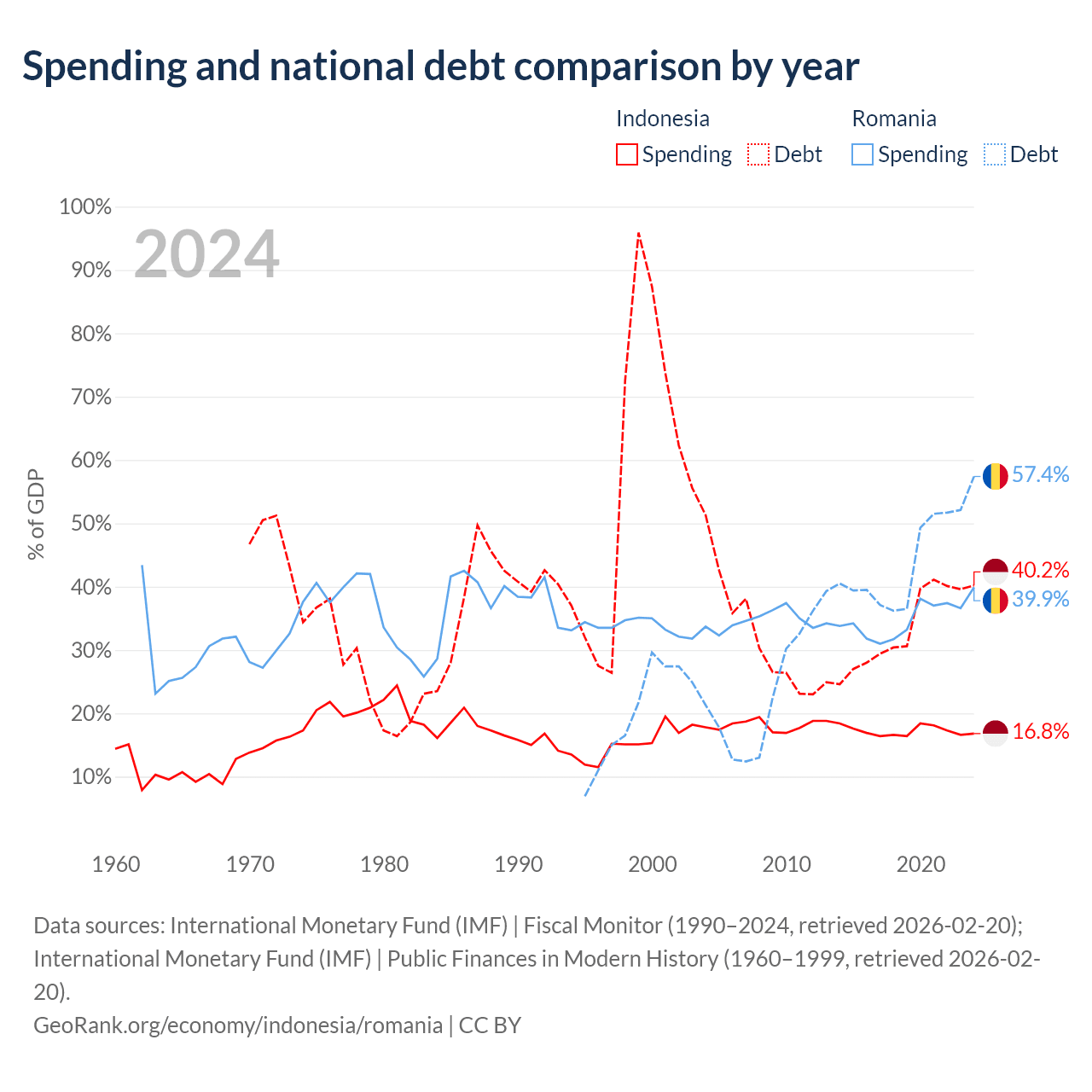 Indonesia has $561B in government debt (40.2% of GDP), compared to $220B (57.4% of GDP) in Romania.