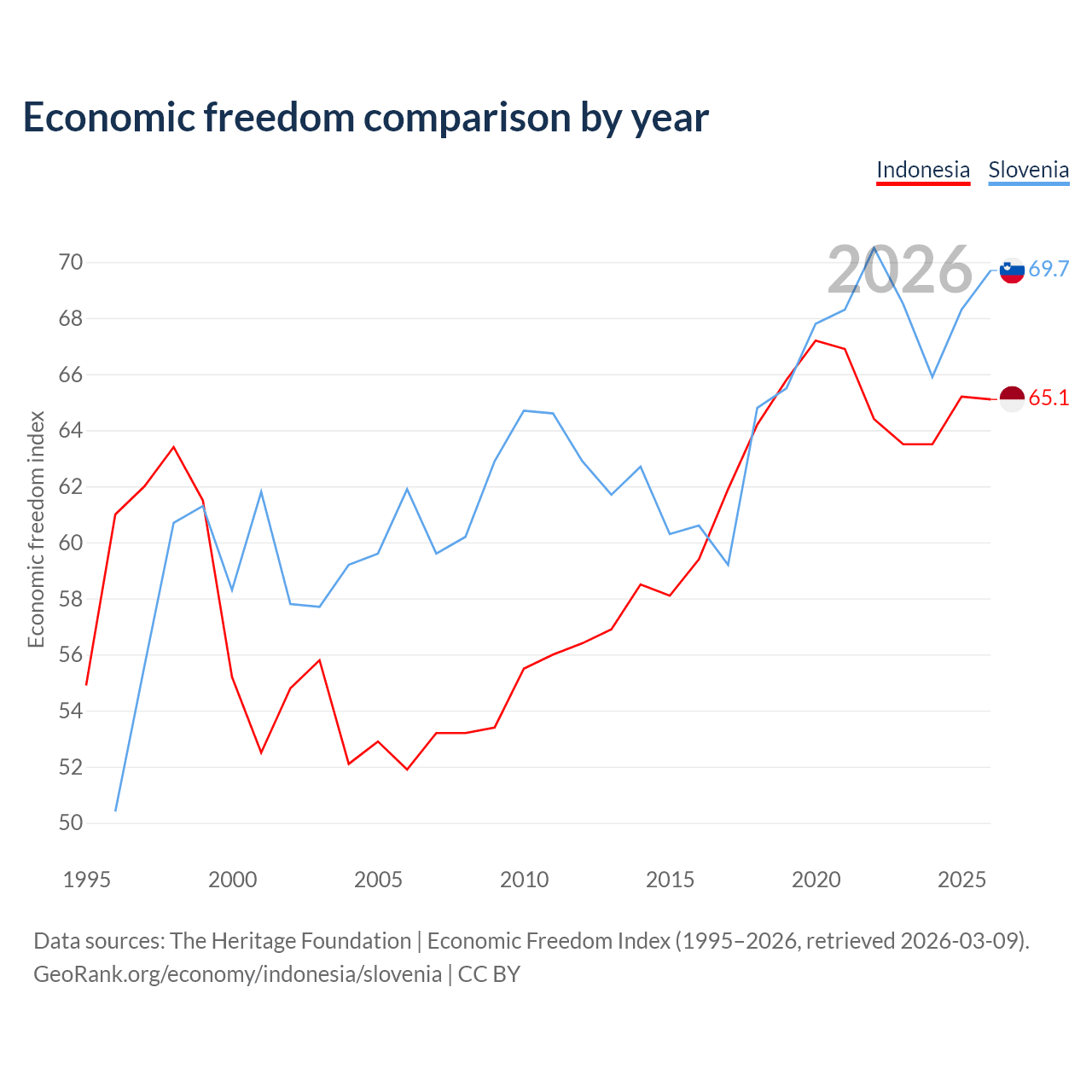 The Economic Freedom Index for Indonesia is 65.1, ranking 67/197, compared to 69.7 for Slovenia, ranking 40/197. The chart above displays a comparison of annual changes in economic freedom indexes.