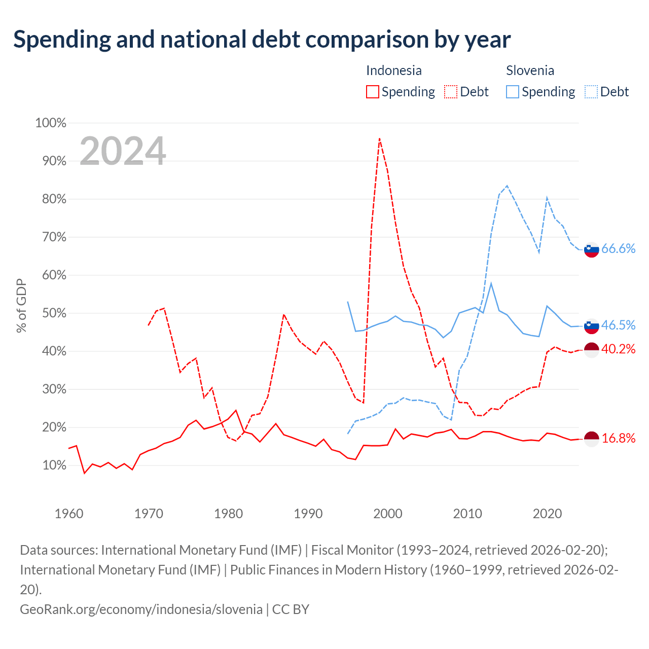 Indonesia has $561B in government debt (40.2% of GDP), compared to $48.6B (66.6% of GDP) in Slovenia.