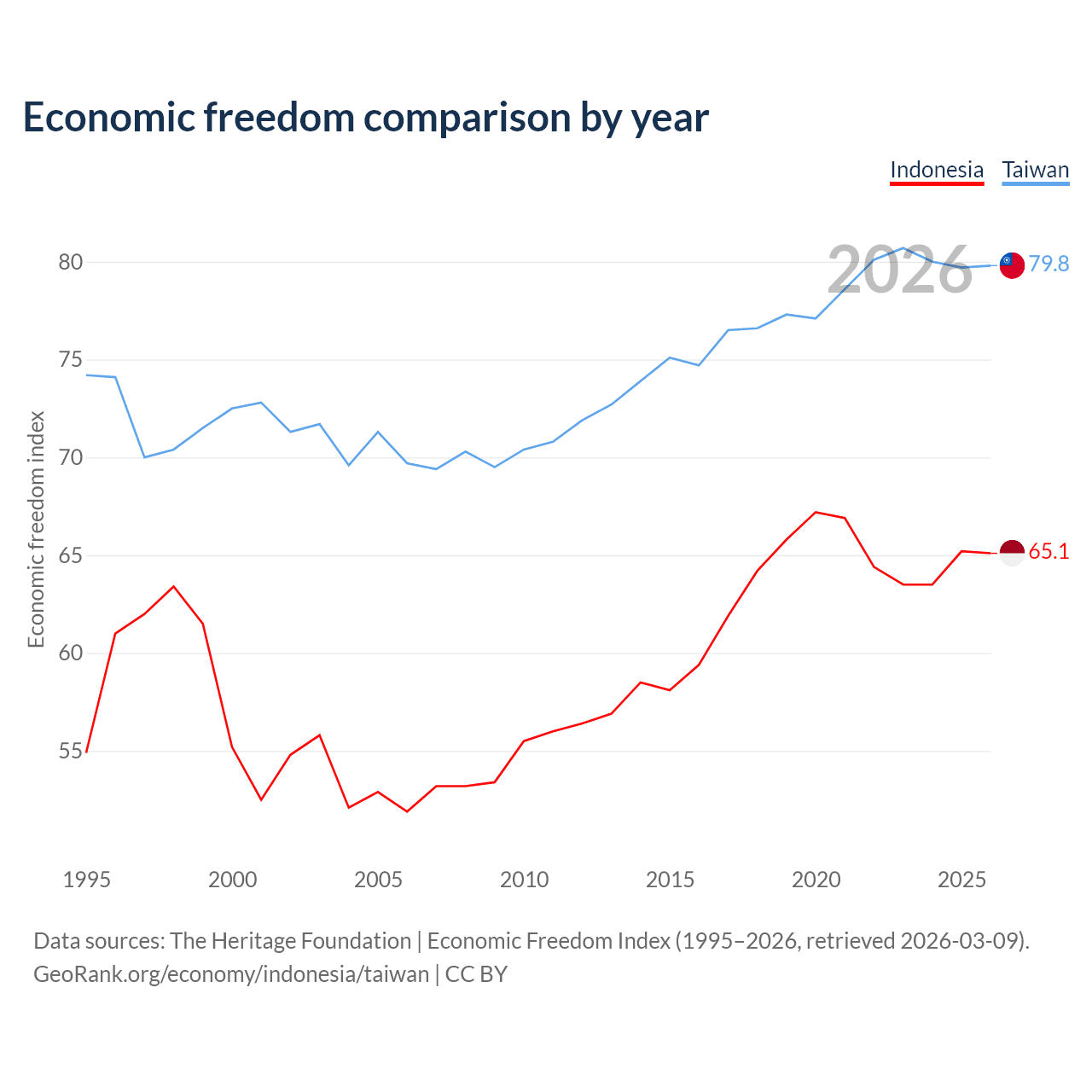 The Economic Freedom Index for Indonesia is 65.1, ranking 67/197, compared to 79.8 for Taiwan, ranking 6/197. The chart above displays a comparison of annual changes in economic freedom indexes.