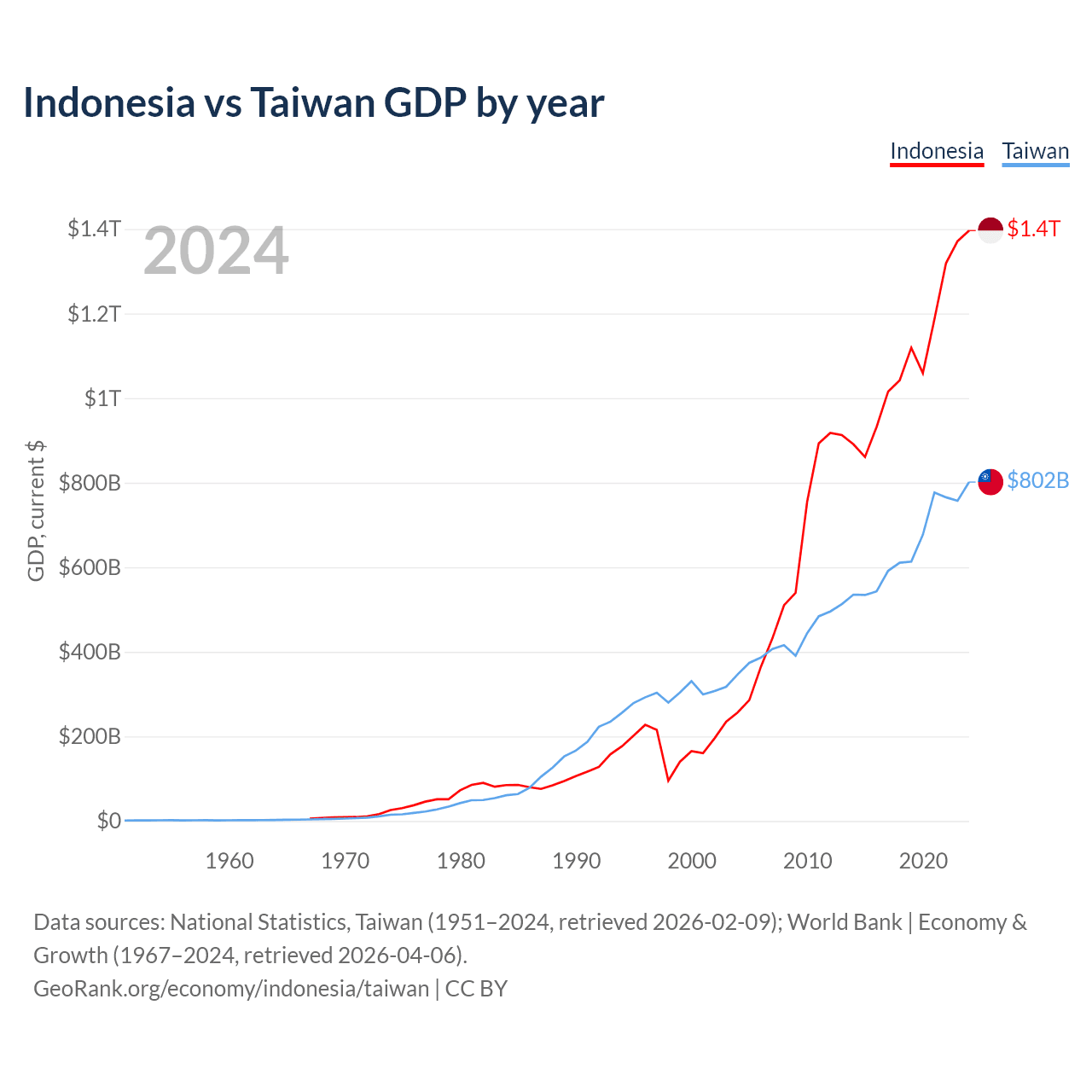 Indonesia has a GDP of $1.4T compared to $802B for Taiwan, ranking 16/197 and 22/197 by economy size, respectively.