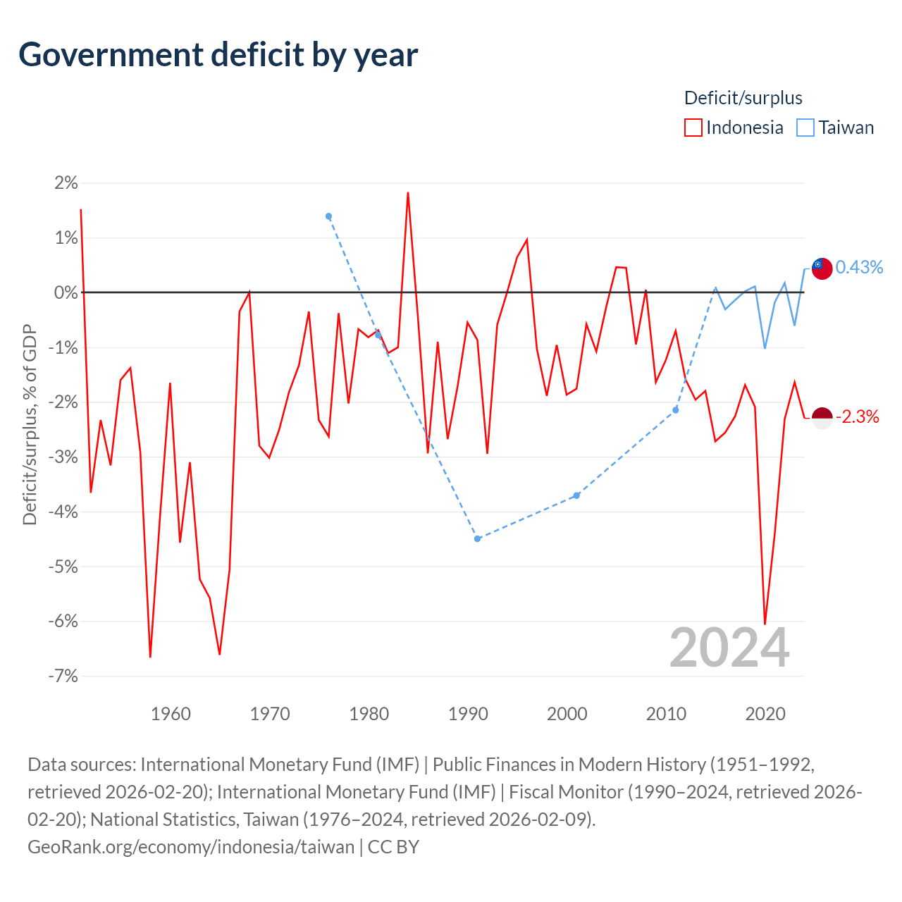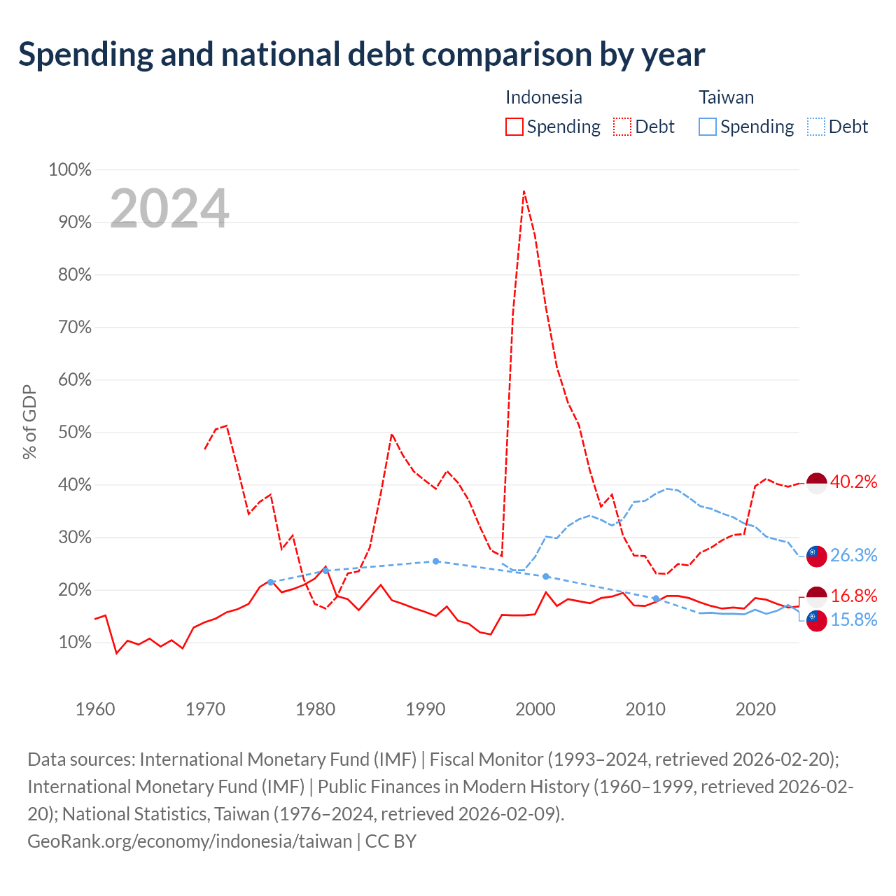 Indonesia has $561B in government debt (40.2% of GDP), compared to $211B (26.3% of GDP) in Taiwan.