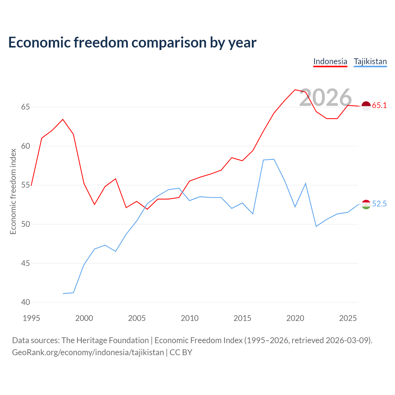 The Economic Freedom Index for Indonesia is 65.1, ranking 67/197, compared to 52.5 for Tajikistan, ranking 147/197. The chart above displays a comparison of annual changes in economic freedom indexes.