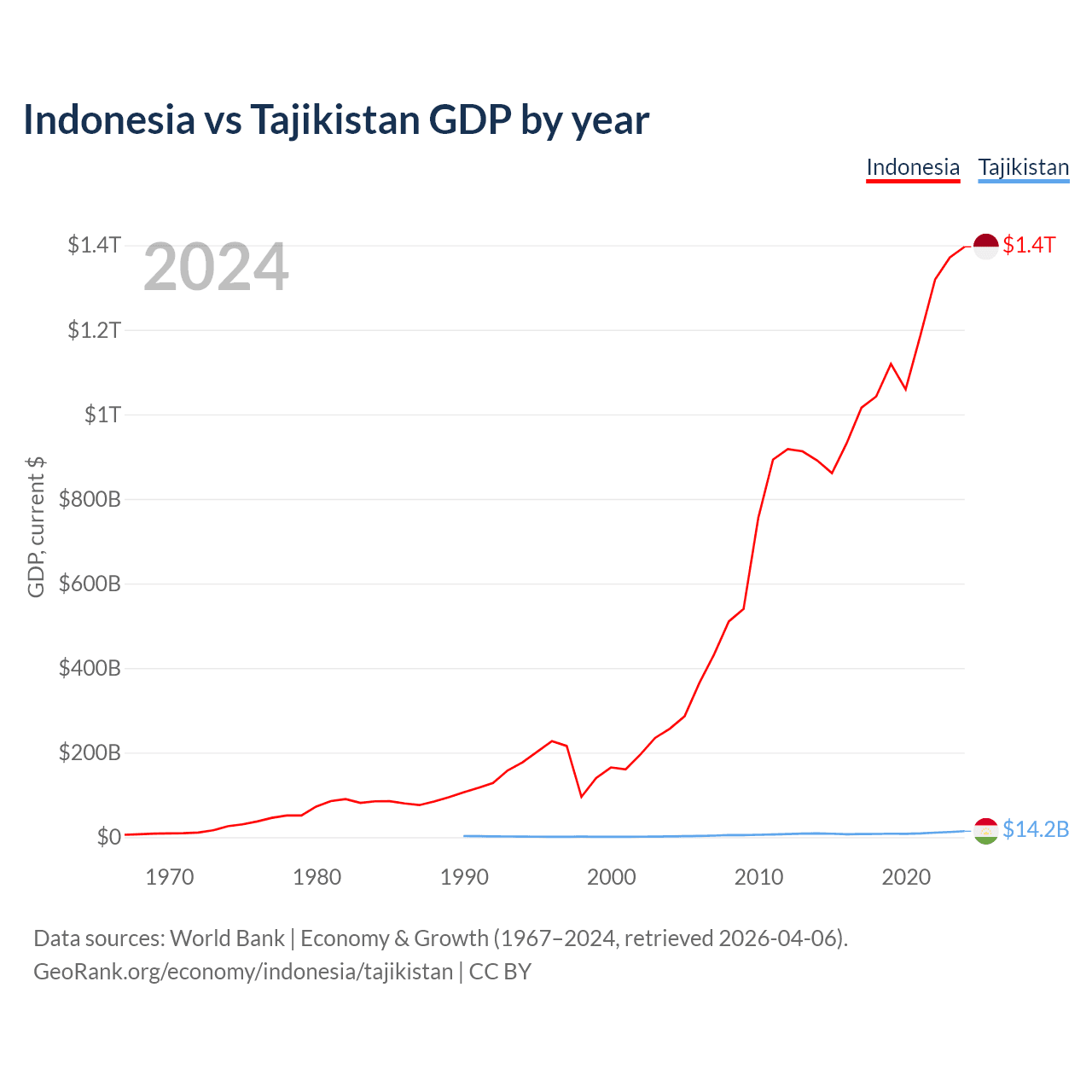 Indonesia has a GDP of $1.4T compared to $14.2B for Tajikistan, ranking 16/197 and 145/197 by economy size, respectively.