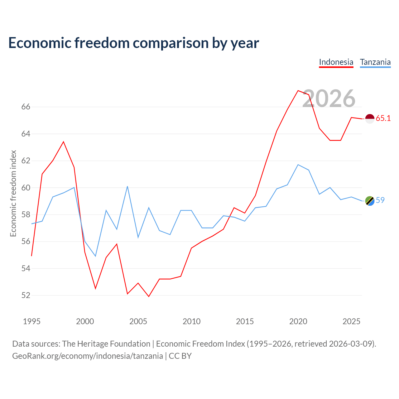 The Economic Freedom Index for Indonesia is 65.1, ranking 67/197, compared to 59 for Tanzania, ranking 106/197. The chart above displays a comparison of annual changes in economic freedom indexes.