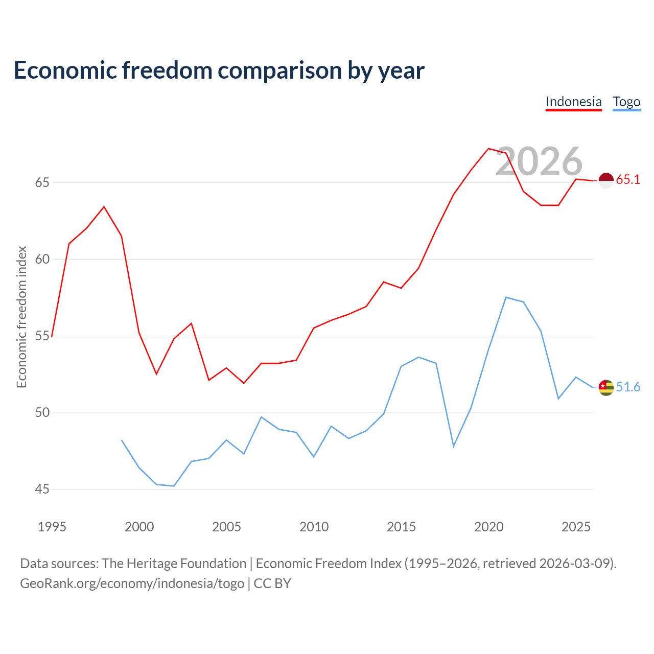 The Economic Freedom Index for Indonesia is 65.1, ranking 67/197, compared to 51.6 for Togo, ranking 153/197. The chart above displays a comparison of annual changes in economic freedom indexes.