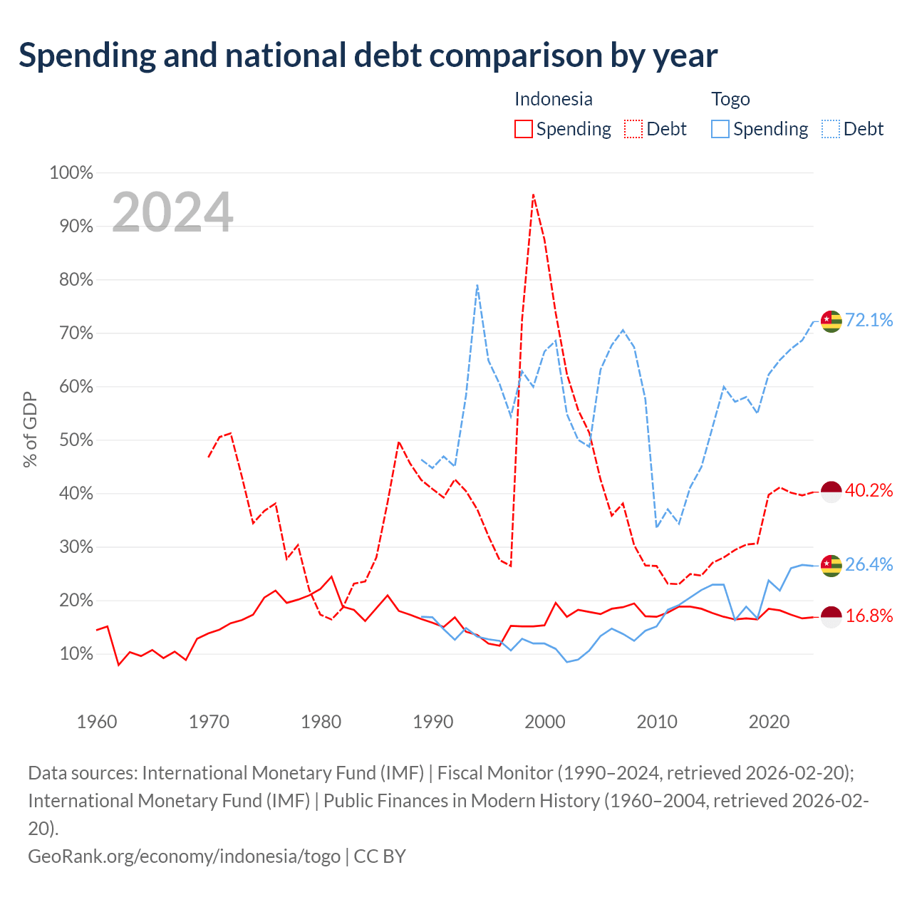 Indonesia has $561B in government debt (40.2% of GDP), compared to $7.68B (72.1% of GDP) in Togo.