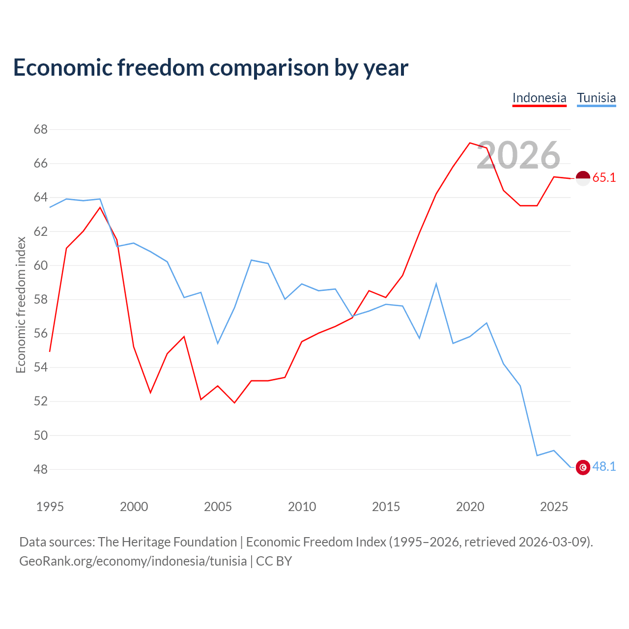 The Economic Freedom Index for Indonesia is 65.1, ranking 67/197, compared to 48.1 for Tunisia, ranking 172/197. The chart above displays a comparison of annual changes in economic freedom indexes.