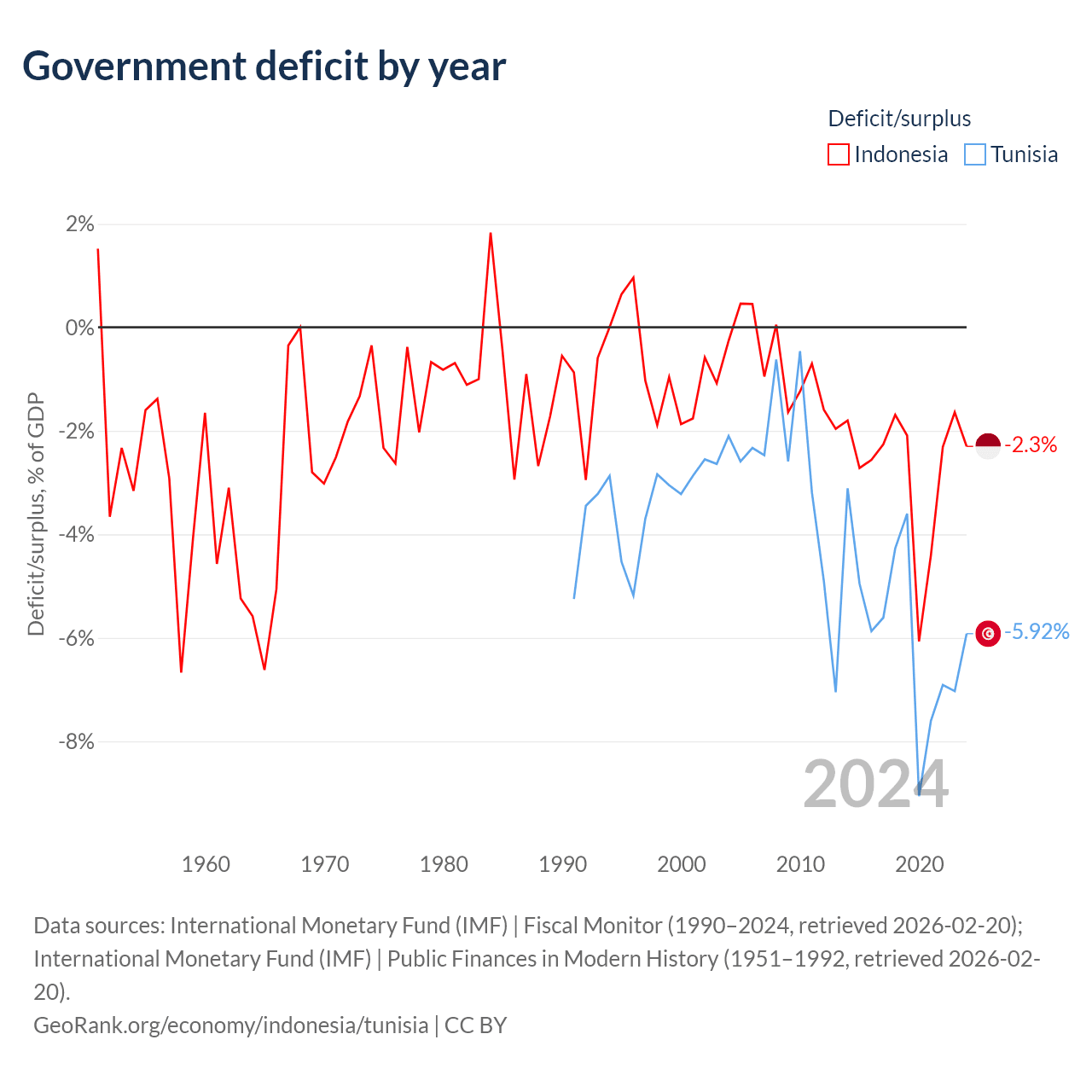 Indonesia has a GDP of $1.4T compared to $51.3B for Tunisia, ranking 16/197 and 93/197 by economy size, respectively.