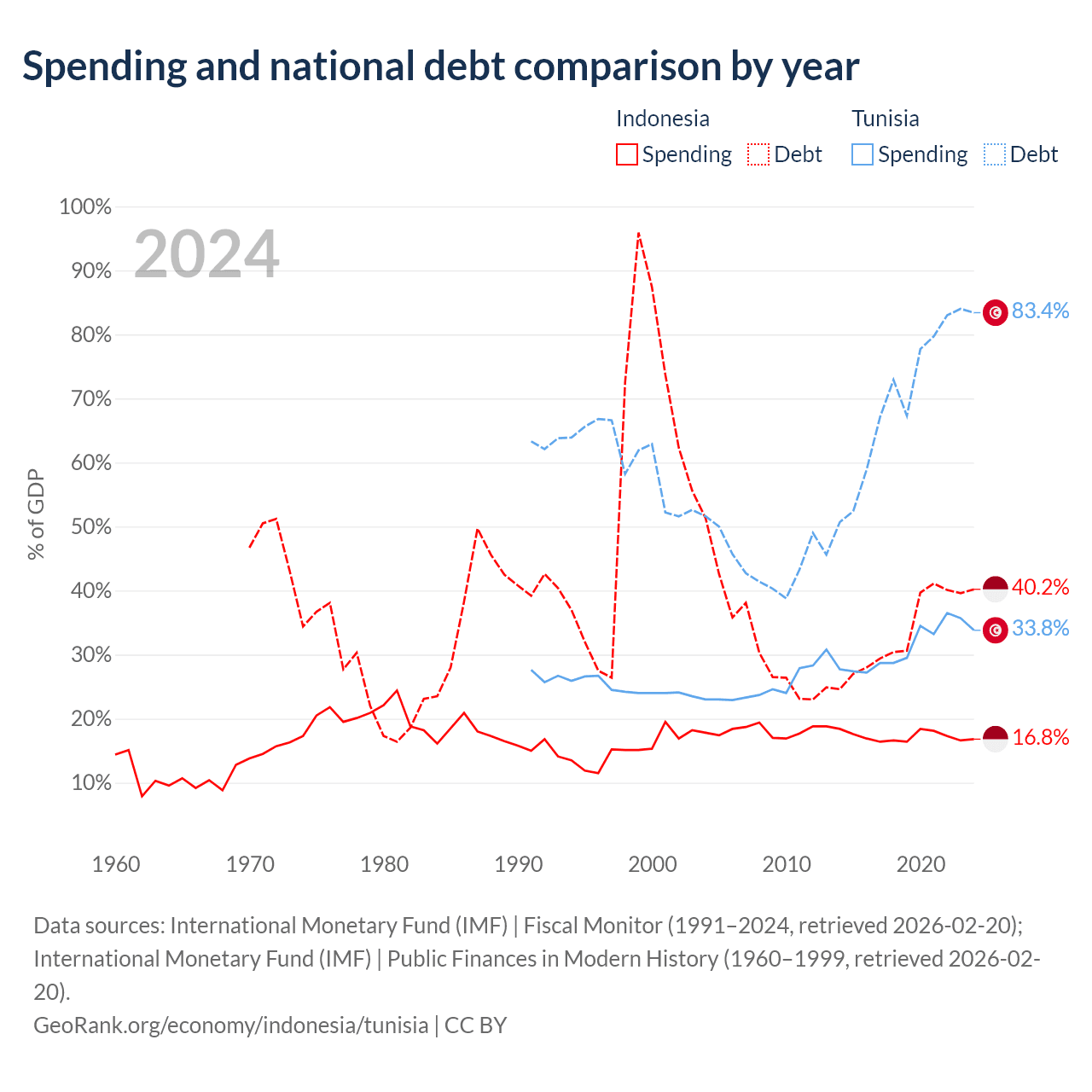 Indonesia has $561B in government debt (40.2% of GDP), compared to $42.8B (83.4% of GDP) in Tunisia.
