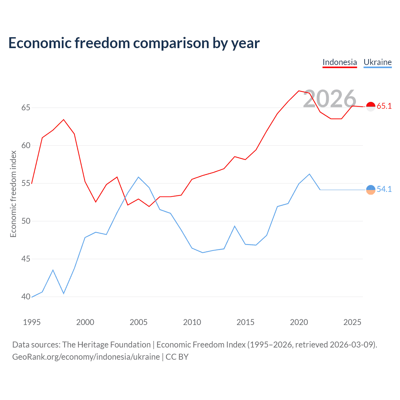The Economic Freedom Index for Indonesia is 65.1, ranking 67/197, compared to 54.1 for Ukraine, ranking 135/197. The chart above displays a comparison of annual changes in economic freedom indexes.