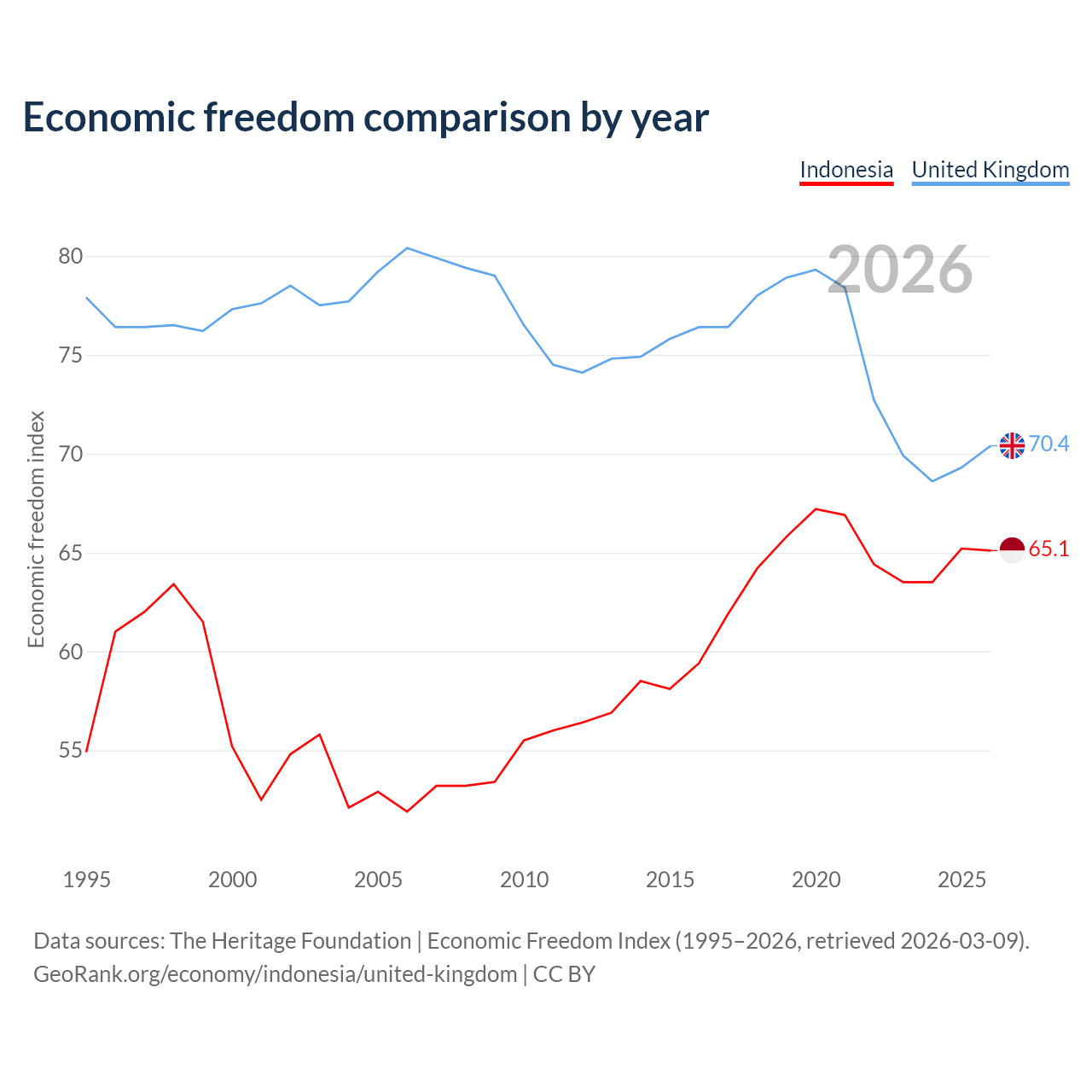 The Economic Freedom Index for Indonesia is 65.1, ranking 67/197, compared to 70.4 for the United Kingdom, ranking 35/197. The chart above displays a comparison of annual changes in economic freedom indexes.