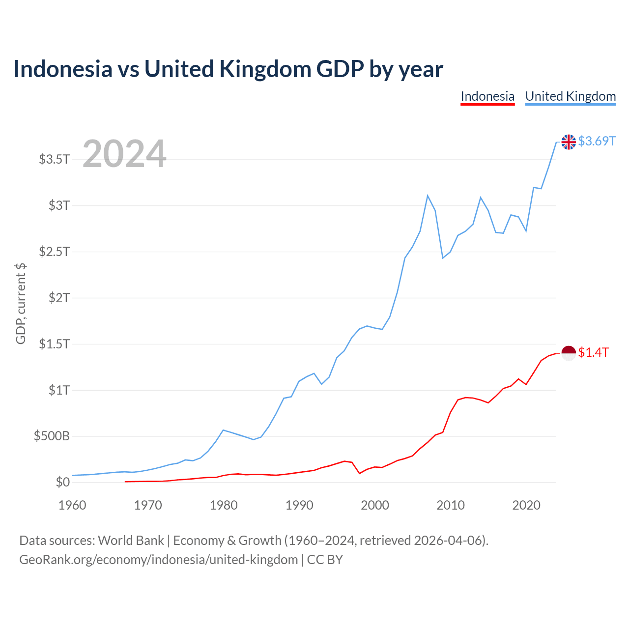 Indonesia has a GDP of $1.4T compared to $3.69T for the United Kingdom, ranking 16/197 and 6/197 by economy size, respectively.