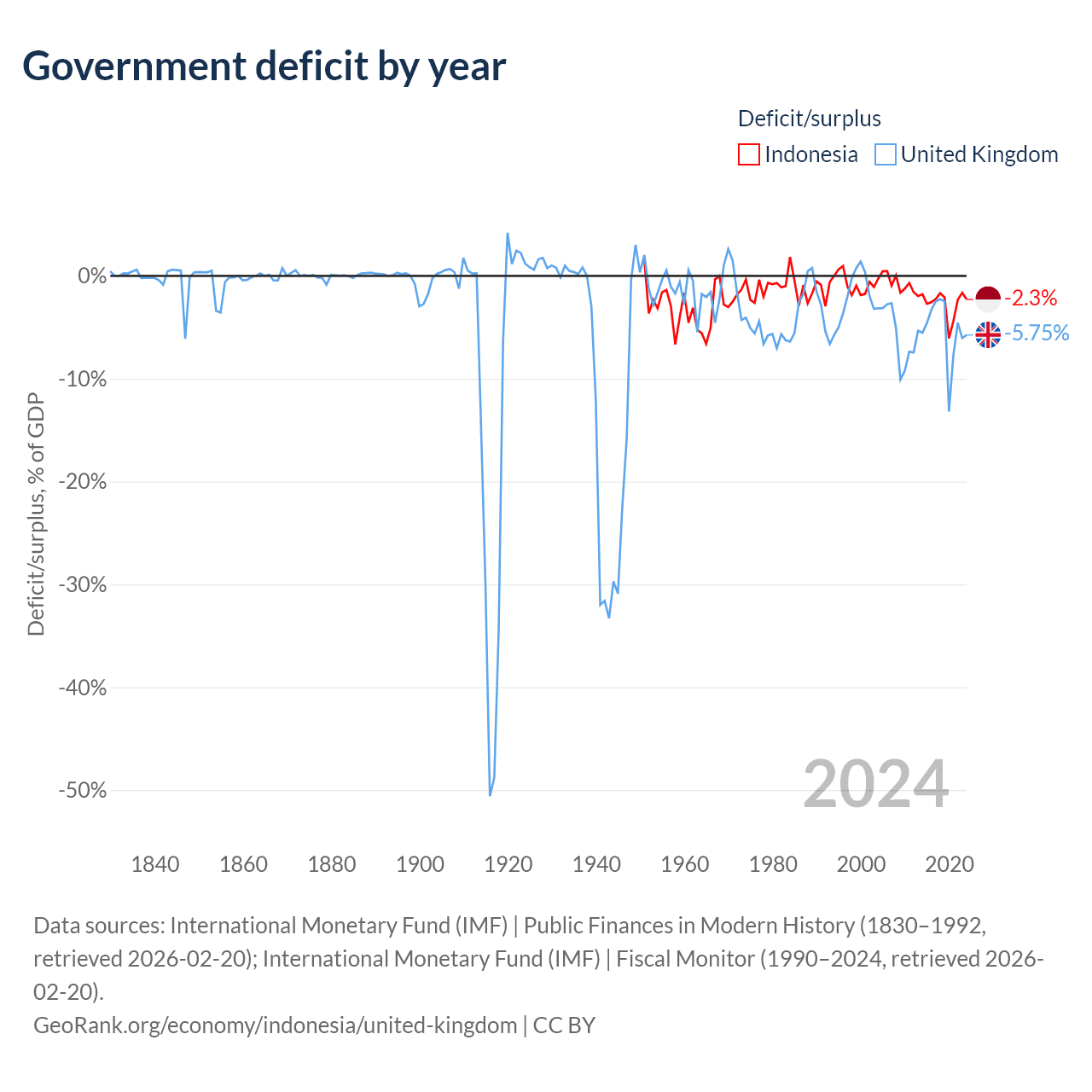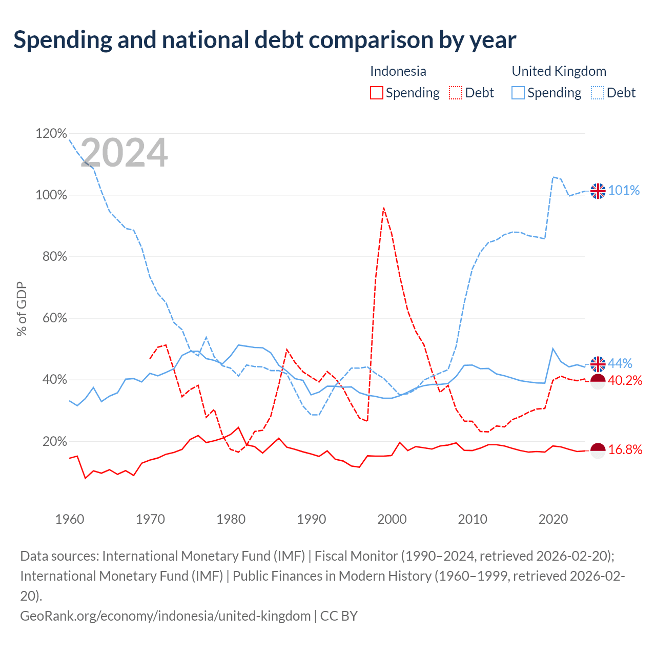 Indonesia has $561B in government debt (40.2% of GDP), compared to $3.73T (101.2% of GDP) in the United Kingdom.
