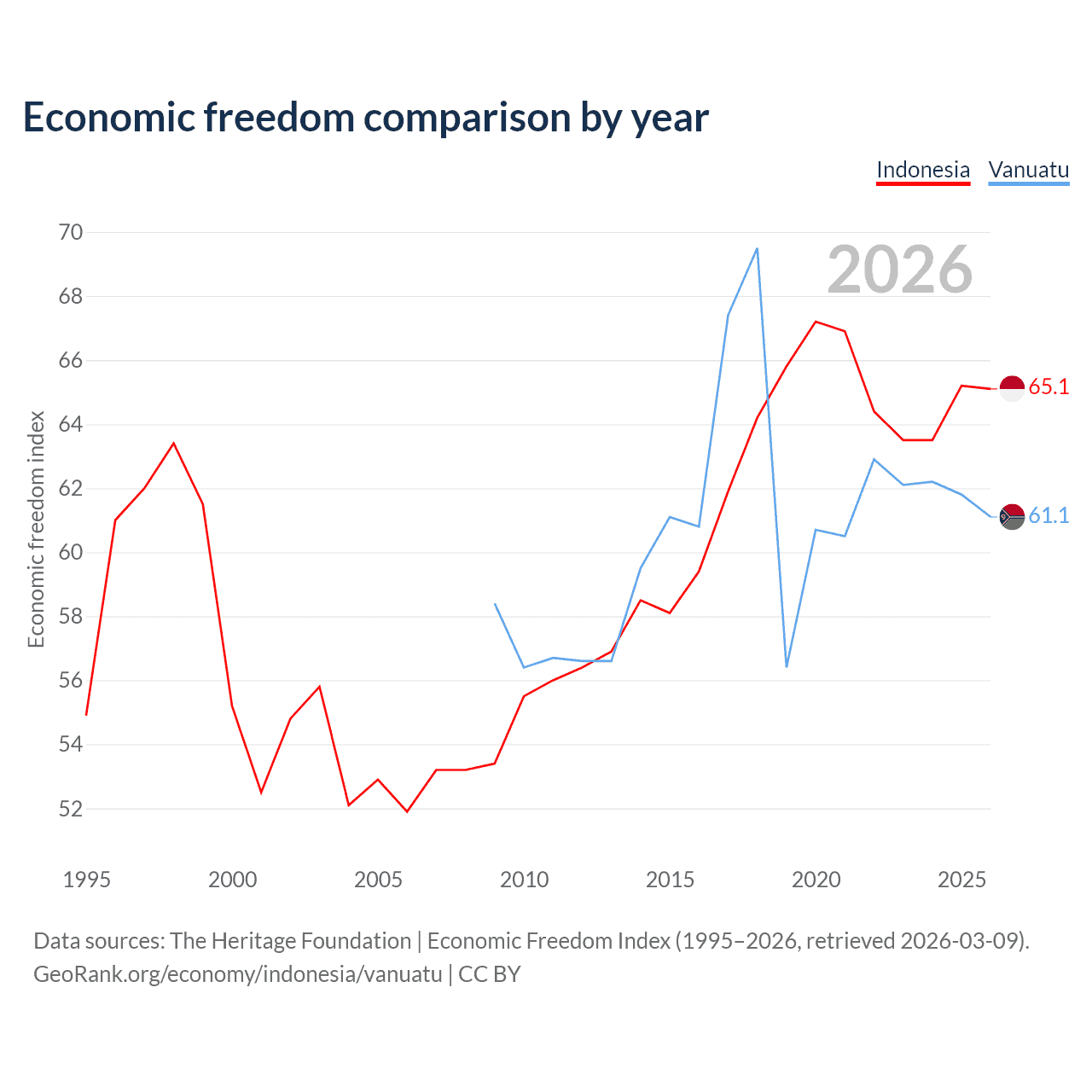 The Economic Freedom Index for Indonesia is 65.1, ranking 67/197, compared to 61.1 for Vanuatu, ranking 92/197. The chart above displays a comparison of annual changes in economic freedom indexes.