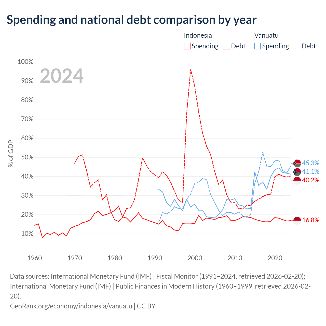 Indonesia has $561B in government debt (40.2% of GDP), compared to $507M (45.3% of GDP) in Vanuatu.