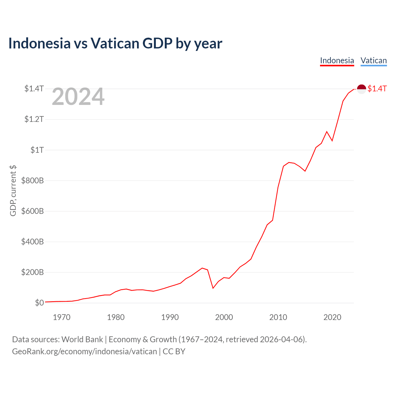 Indonesia has a GDP of $1.4T compared to $19.8M for the Vatican, ranking 16/197 and 197/197 by economy size, respectively.